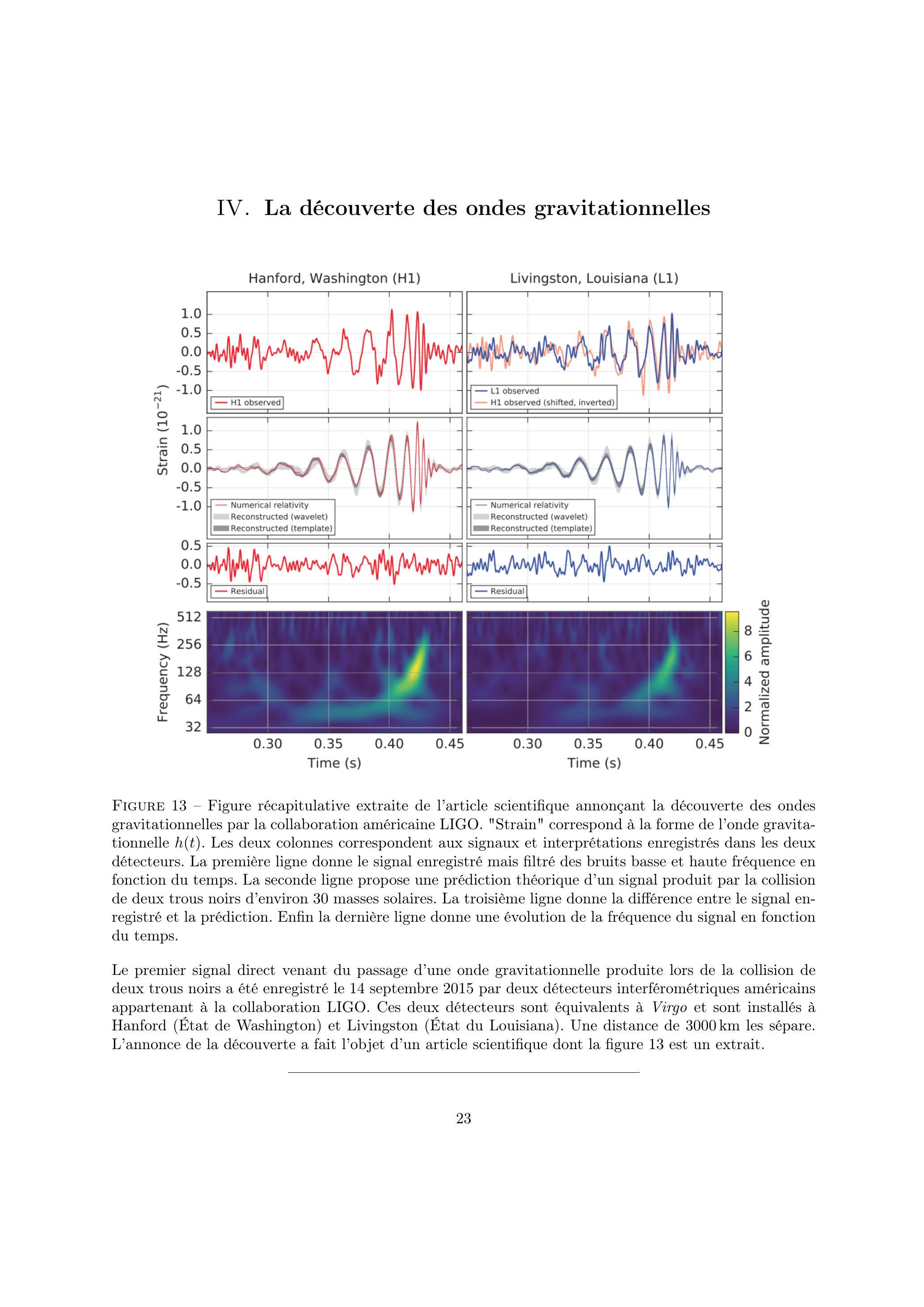 Le premier signal direct venant du passage d'une onde gravitationnelle produite lors de la collision de deux trous noirs a été enregistré le 14 septembre 2015 par deux détecteurs interférométriques américains appartenant à la collaboration LIGO. Ces deux détecteurs sont équivalents à Virgo et sont installés à Hanford (État de Washington) et Livingston (État du Louisiana). Une distance de 3000 km les sépare. L'annonce de la découverte a fait l'objet d'un article scientifique dont la figure 13 est un extrait.
