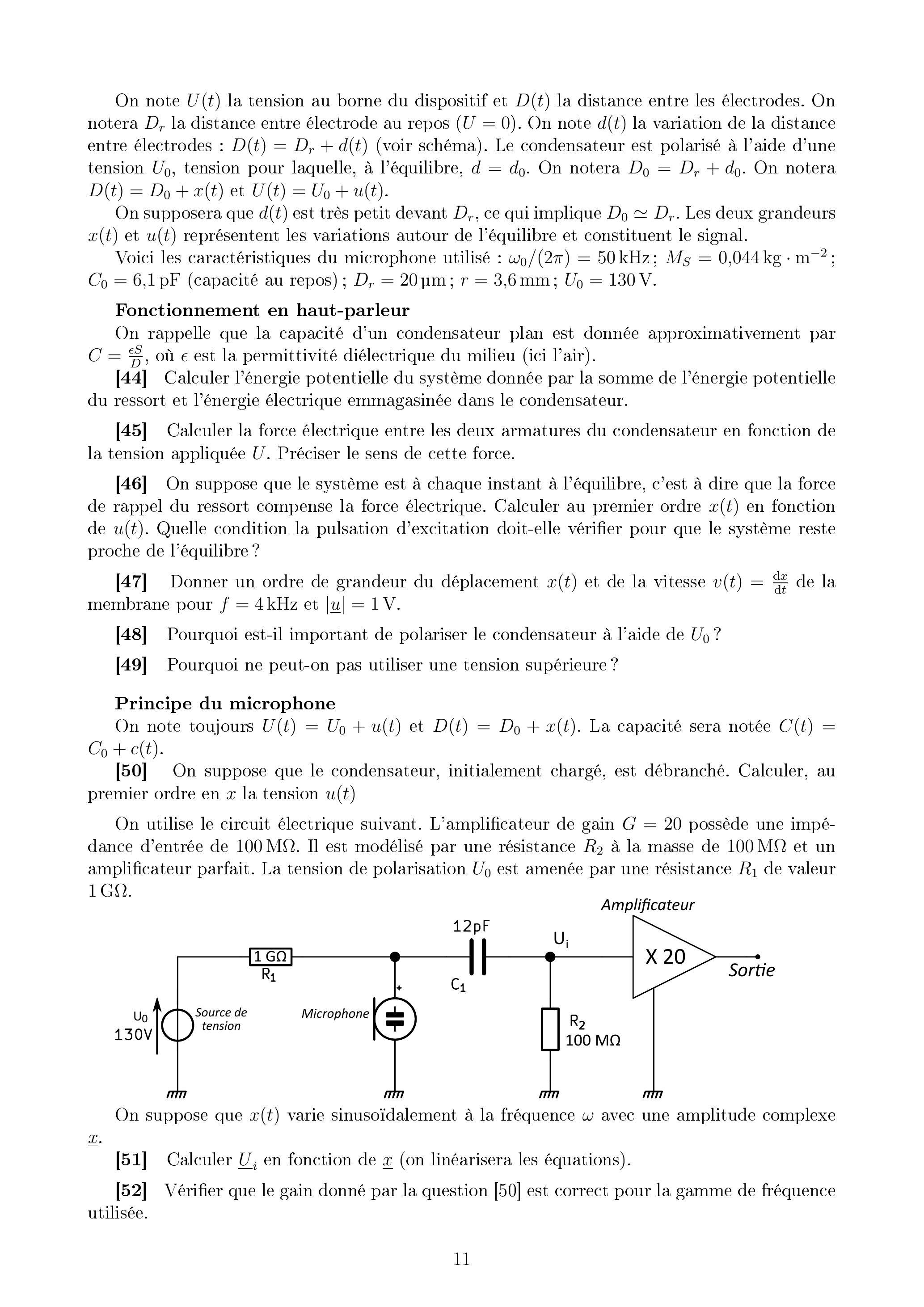 [54] En déduire la sensibilité en pression du microphone. Faire une application numérique. Par la suite on prendra la donnée du constructeur, pour une polarisation de 130 V (cette valeur est différente mais est du même ordre de grandeur que celle calculée).