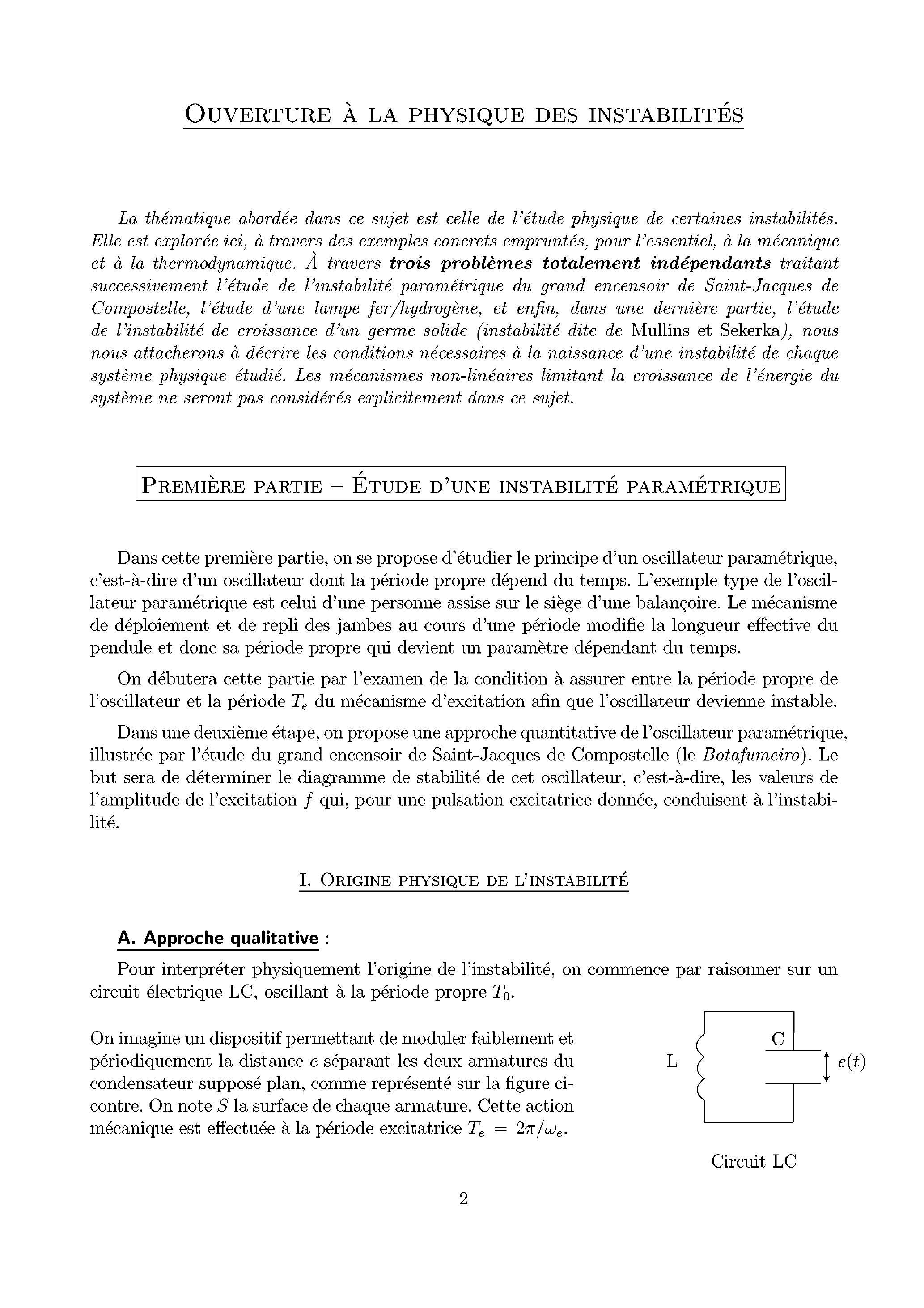 La thématique abordée dans ce sujet est celle de l'étude physique de certaines instabilités. Elle est explorée ici, à travers des exemples concrets empruntés, pour l'essentiel, à la mécanique et à la thermodynamique. À travers trois problèmes totalement indépendants traitant successivement l'étude de l'instabilité paramétrique du grand encensoir de Saint-Jacques de Compostelle, l'étude d'une lampe fer/hydrogène, et enfin, dans une dernière partie, l'étude de l'instabilité de croissance d'un germe solide (instabilité dite de Mullins et Sekerka), nous nous attacherons à décrire les conditions nécessaires à la naissance d'une instabilité de chaque système physique étudié. Les mécanismes non-linéaires limitant la croissance de l'énergie du système ne seront pas considérés explicitement dans ce sujet.