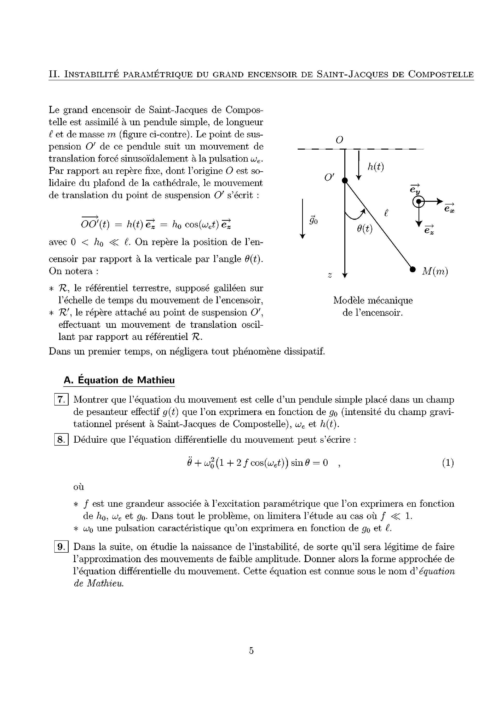 Le grand encensoir de Saint-Jacques de Compostelle est assimilé à un pendule simple, de longueur et de masse (figure ci-contre). Le point de suspension de ce pendule suit un mouvement de translation forcé sinusoïdalement à la pulsation . Par rapport au repère fixe, dont l'origine est solidaire du plafond de la cathédrale, le mouvement de translation du point de suspension s'écrit :