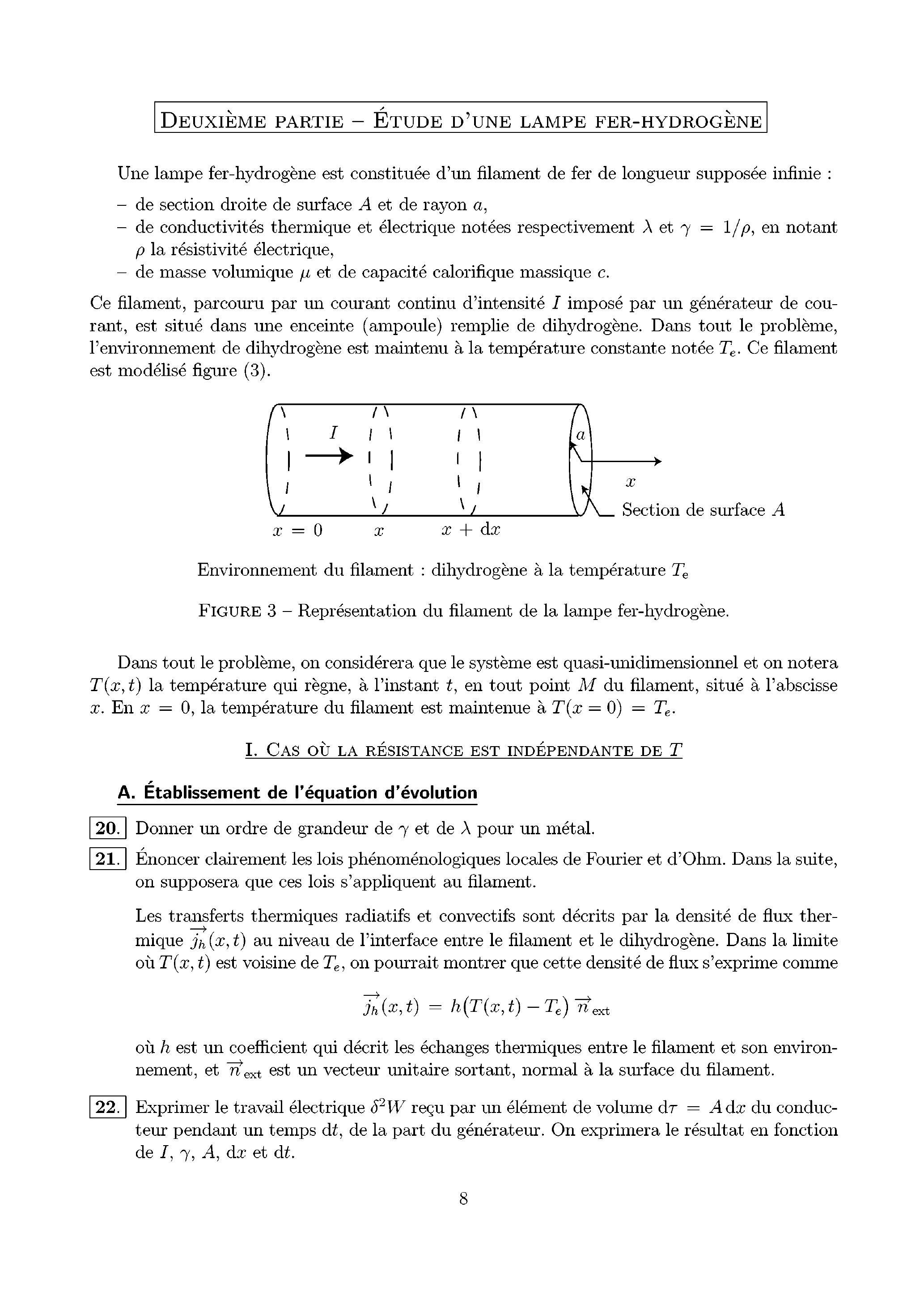 Ce filament, parcouru par un courant continu d'intensité imposé par un générateur de courant, est situé dans une enceinte (ampoule) remplie de dihydrogène. Dans tout le problème, l'environnement de dihydrogène est maintenu à la température constante notée . Ce filament est modélisé figure (3).