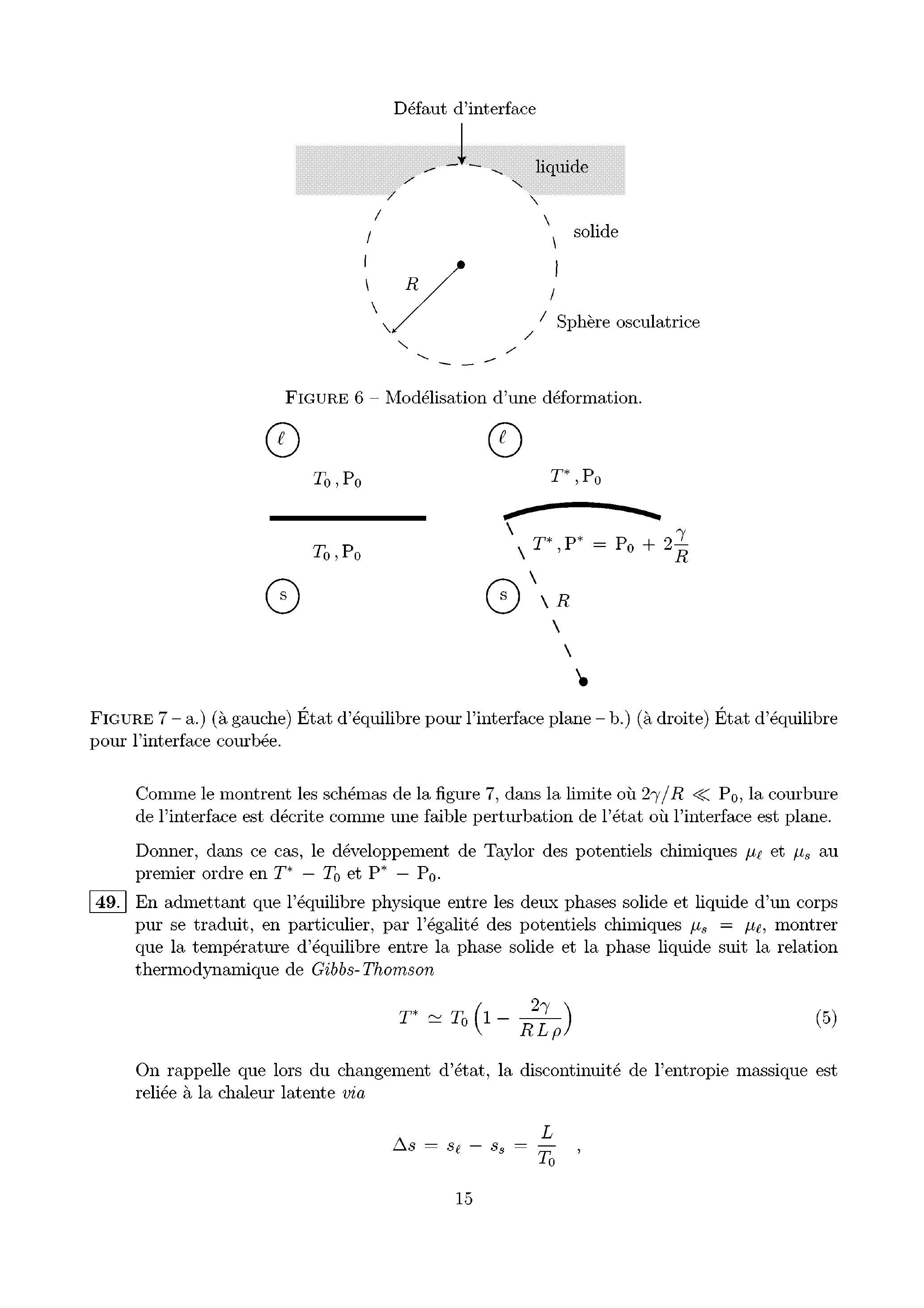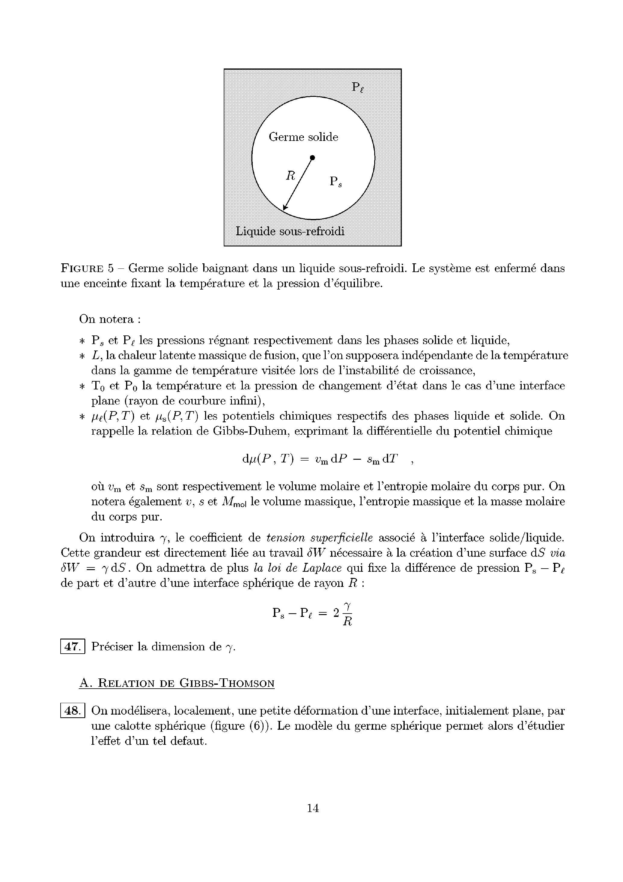 49. En admettant que l'équilibre physique entre les deux phases solide et liquide d'un corps pur se traduit, en particulier, par l'égalité des potentiels chimiques , montrer que la température d'équilibre entre la phase solide et la phase liquide suit la relation thermodynamique de Gibbs-Thomson