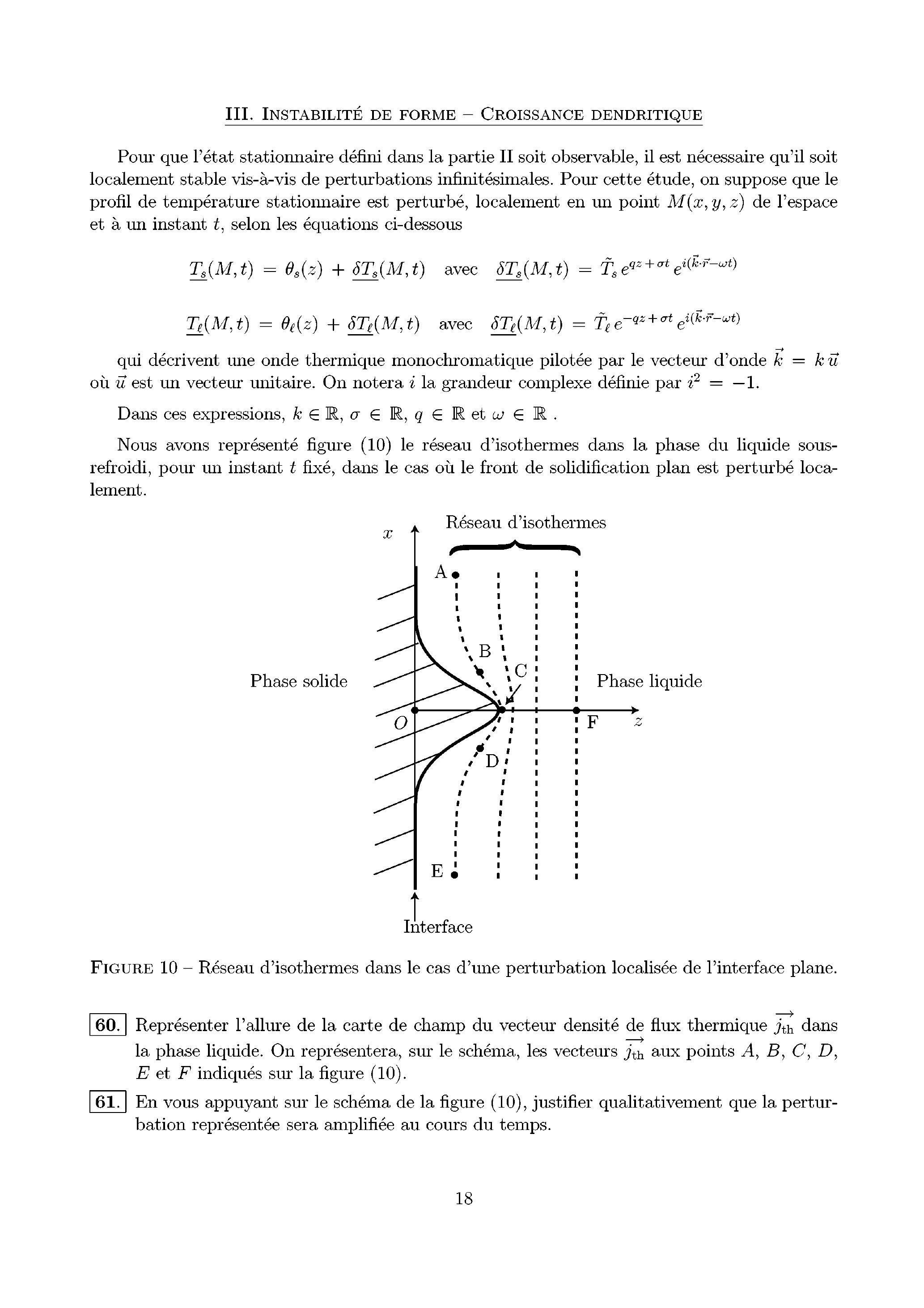 Proposer un nouveau schéma décrivant l'état de l'interface et l'allure du réseau d'isothermes à un instant ultérieur. Donner la condition portant sur , pour que la perturbation envisagée déstabilise le front de solidification plan.