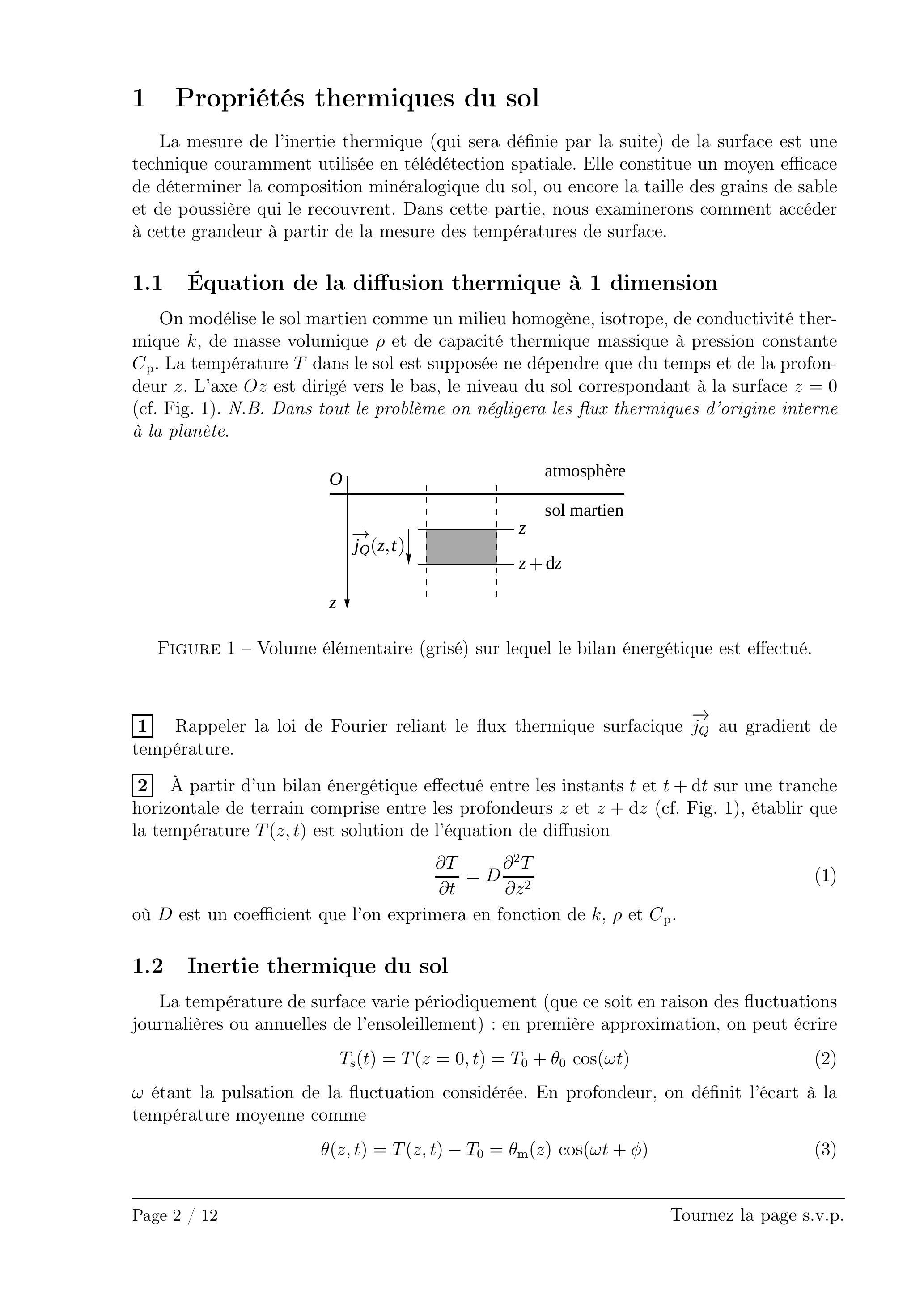 On modélise le sol martien comme un milieu homogène, isotrope, de conductivité thermique , de masse volumique et de capacité thermique massique à pression constante . La température dans le sol est supposée ne dépendre que du temps et de la profondeur . L'axe est dirigé vers le bas, le niveau du sol correspondant à la surface (cf. Fig. 1). N.B. Dans tout le problème on négligera les flux thermiques d'origine interne à la planète.