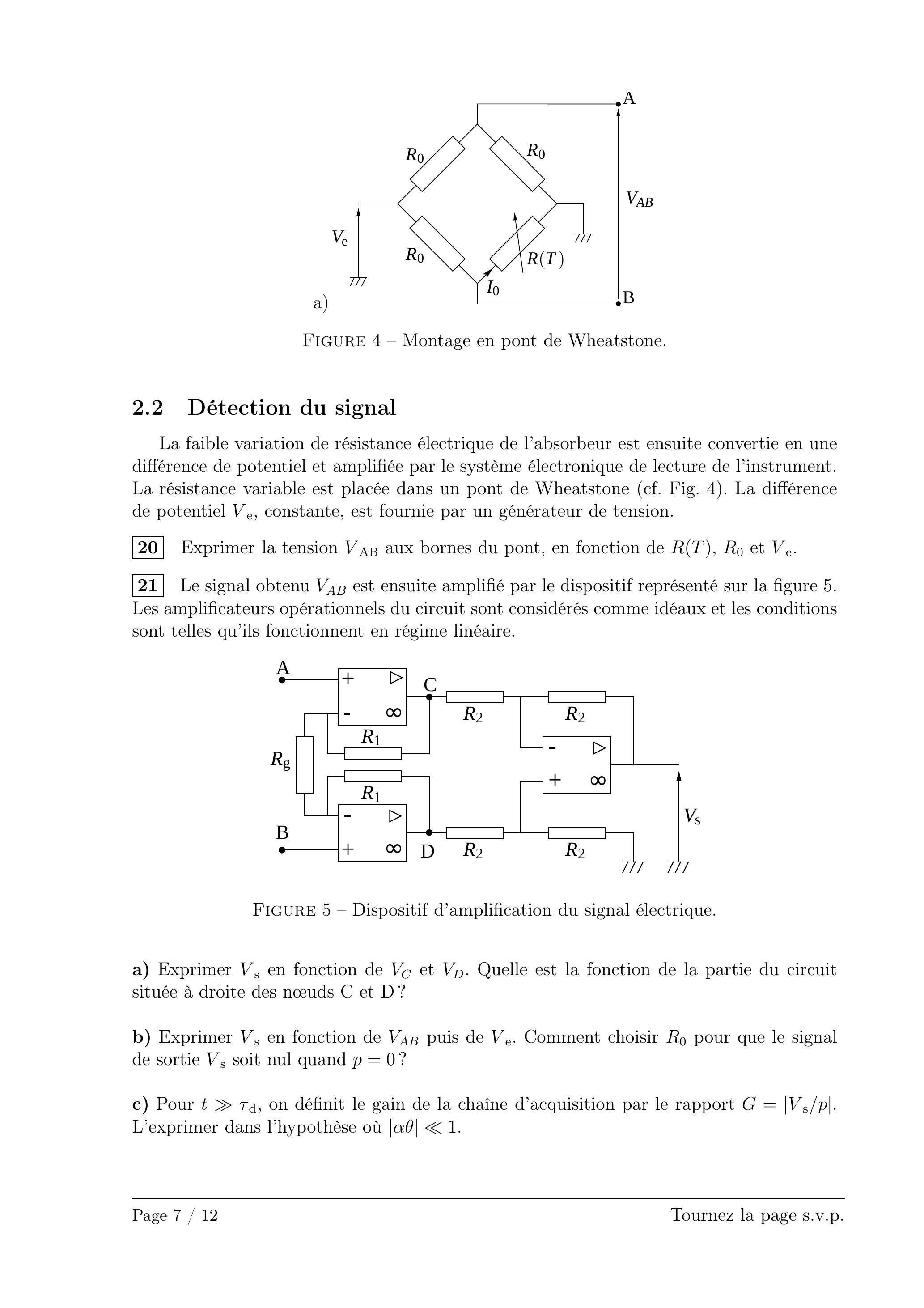 21 Le signal obtenu est ensuite amplifié par le dispositif représenté sur la figure 5. Les amplificateurs opérationnels du circuit sont considérés comme idéaux et les conditions sont telles qu'ils fonctionnent en régime linéaire.