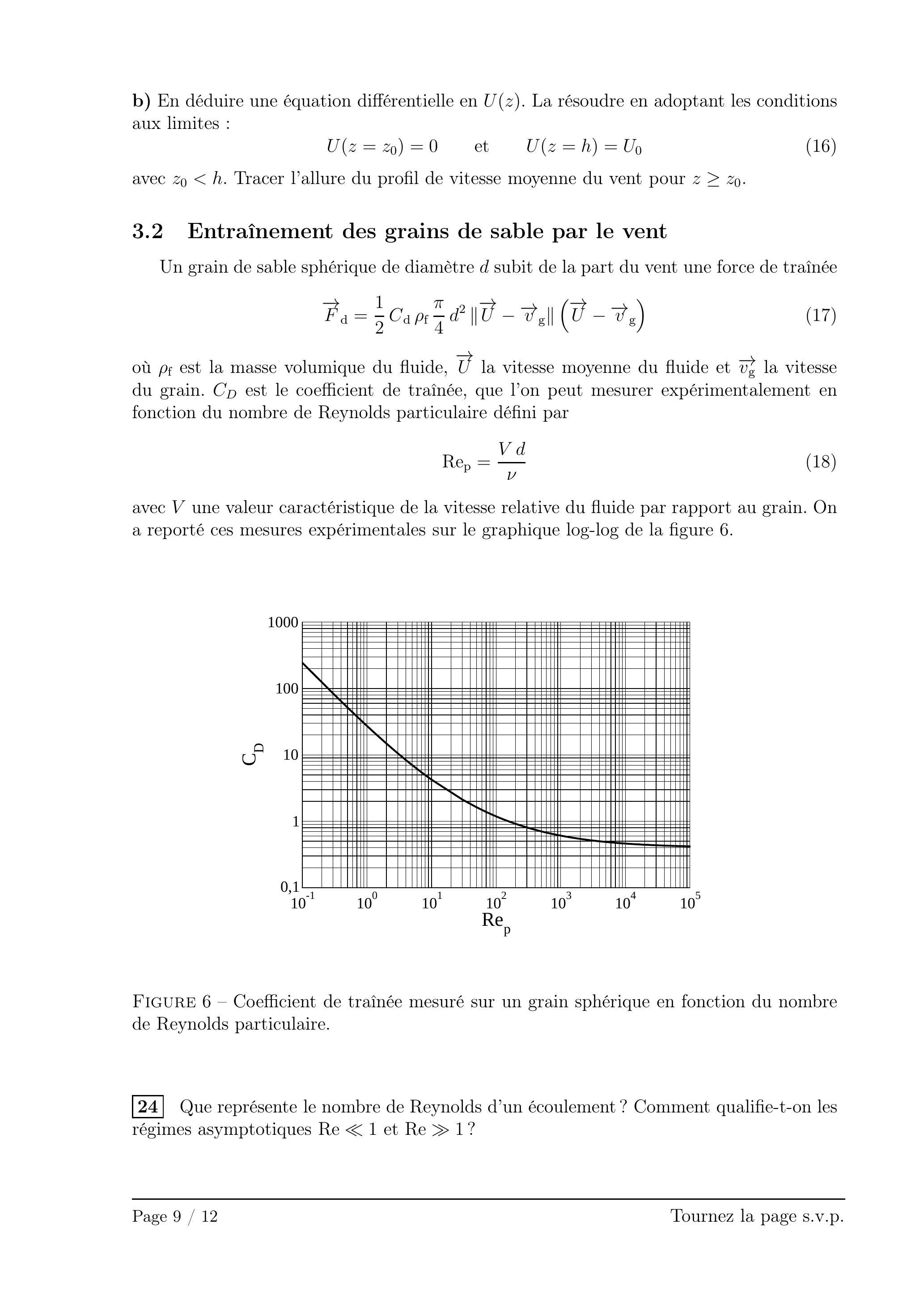 26 On considère un grain de sable, de diamètre et de masse volumique , au repos à l'instant . Il est entraîné par le vent dont la vitesse horizontale est supposée uniforme et constante. On néglige l'influence de la gravité ainsi que les interactions entre les grains de sable.