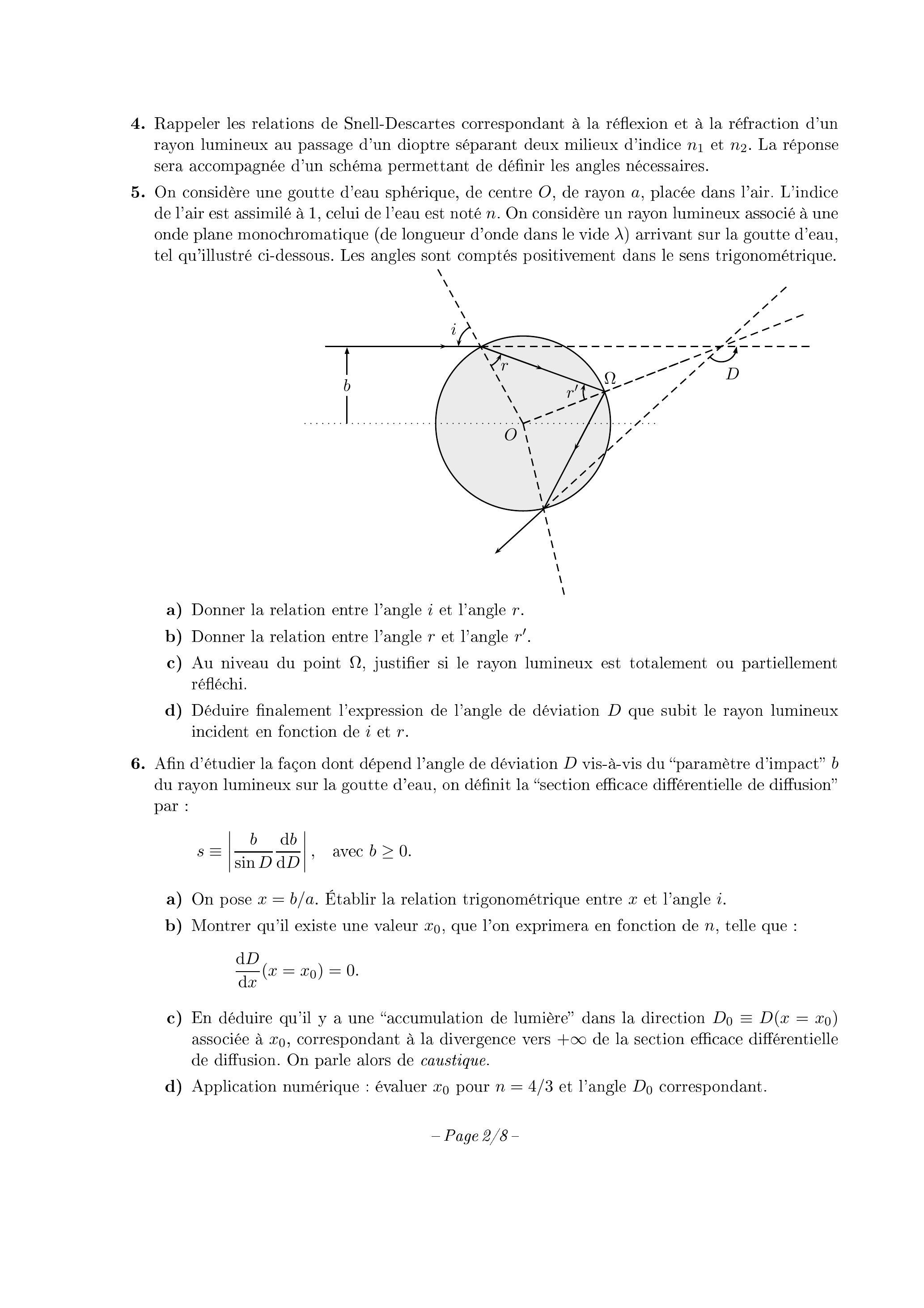 On considère une goutte d'eau sphérique, de centre , de rayon , placée dans l'air. L'indice de l'air est assimilé à 1 , celui de l'eau est noté . On considère un rayon lumineux associé à une onde plane monochromatique (de longueur d'onde dans le vide ) arrivant sur la goutte d'eau, tel qu'illustré ci-dessous. Les angles sont comptés positivement dans le sens trigonométrique.