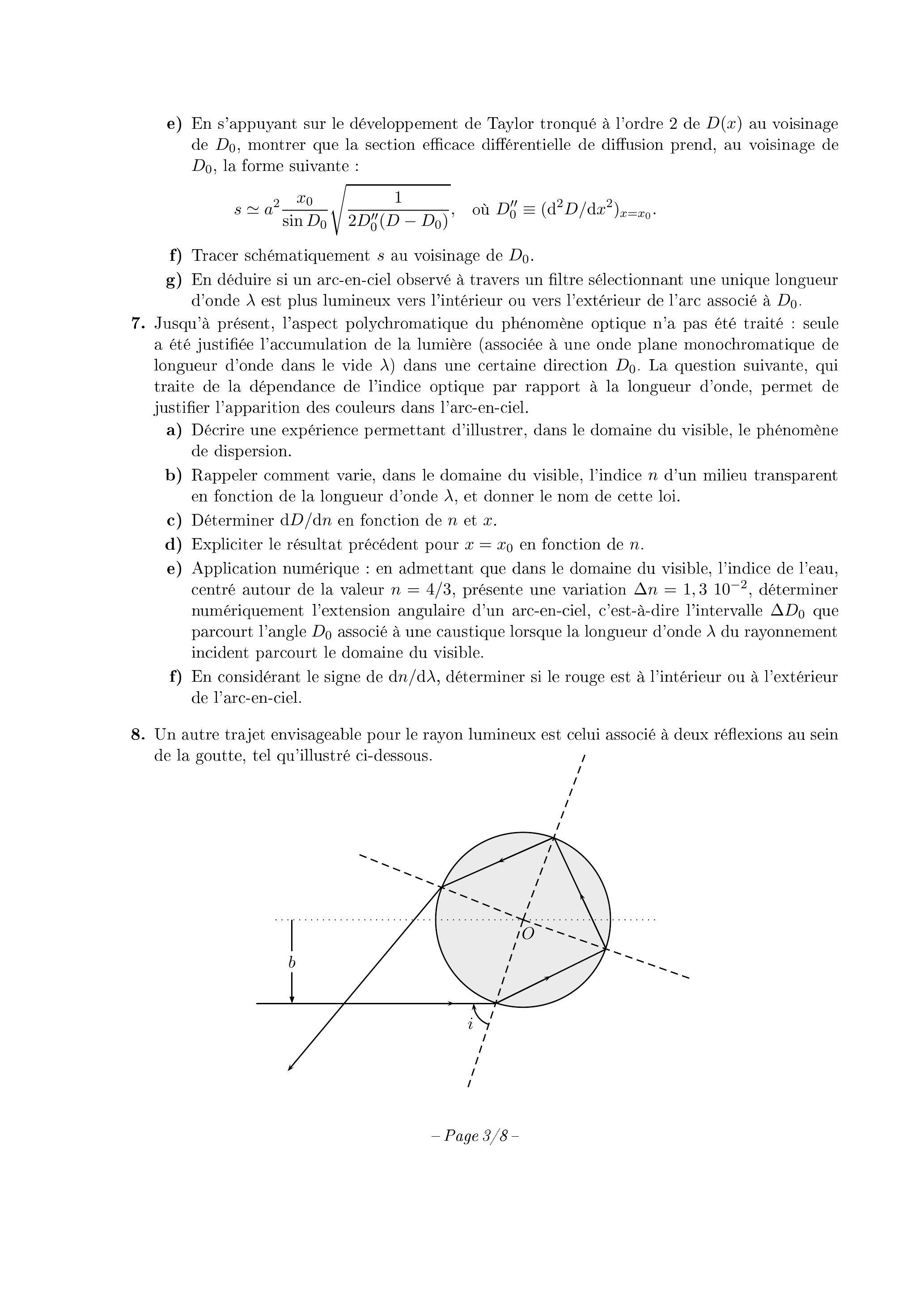 e) Application numérique : en admettant que dans le domaine du visible, l'indice de l'eau, centré autour de la valeur , présente une variation , déterminer numériquement l'extension angulaire d'un arc-en-ciel, c'est-à-dire l'intervalle que parcourt l'angle associé à une caustique lorsque la longueur d'onde du rayonnement incident parcourt le domaine du visible.