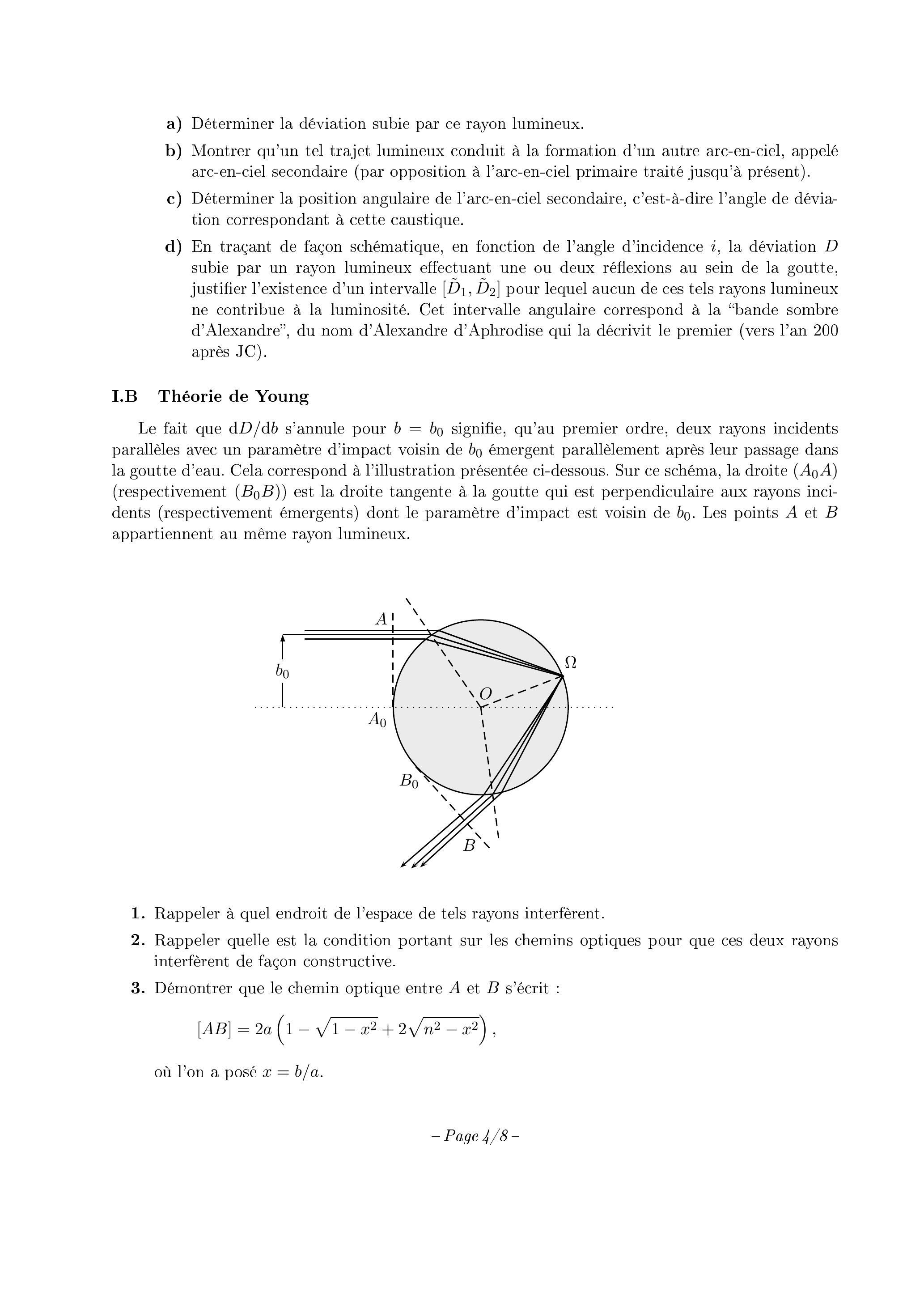 Cette épreuve est constituée de deux problèmes. Le premier propose de donner une explication au phénomène de l'arc-en-ciel, tout d'abord dans un cadre simplifié d'optique géométrique, puis dans une approche plus complète d'optique ondulatoire. Le second problème, traitant de la formation et de la croissance de gouttes d'eau, est totalement indépendant du premier, et est lui-même constitué de deux parties autonomes.