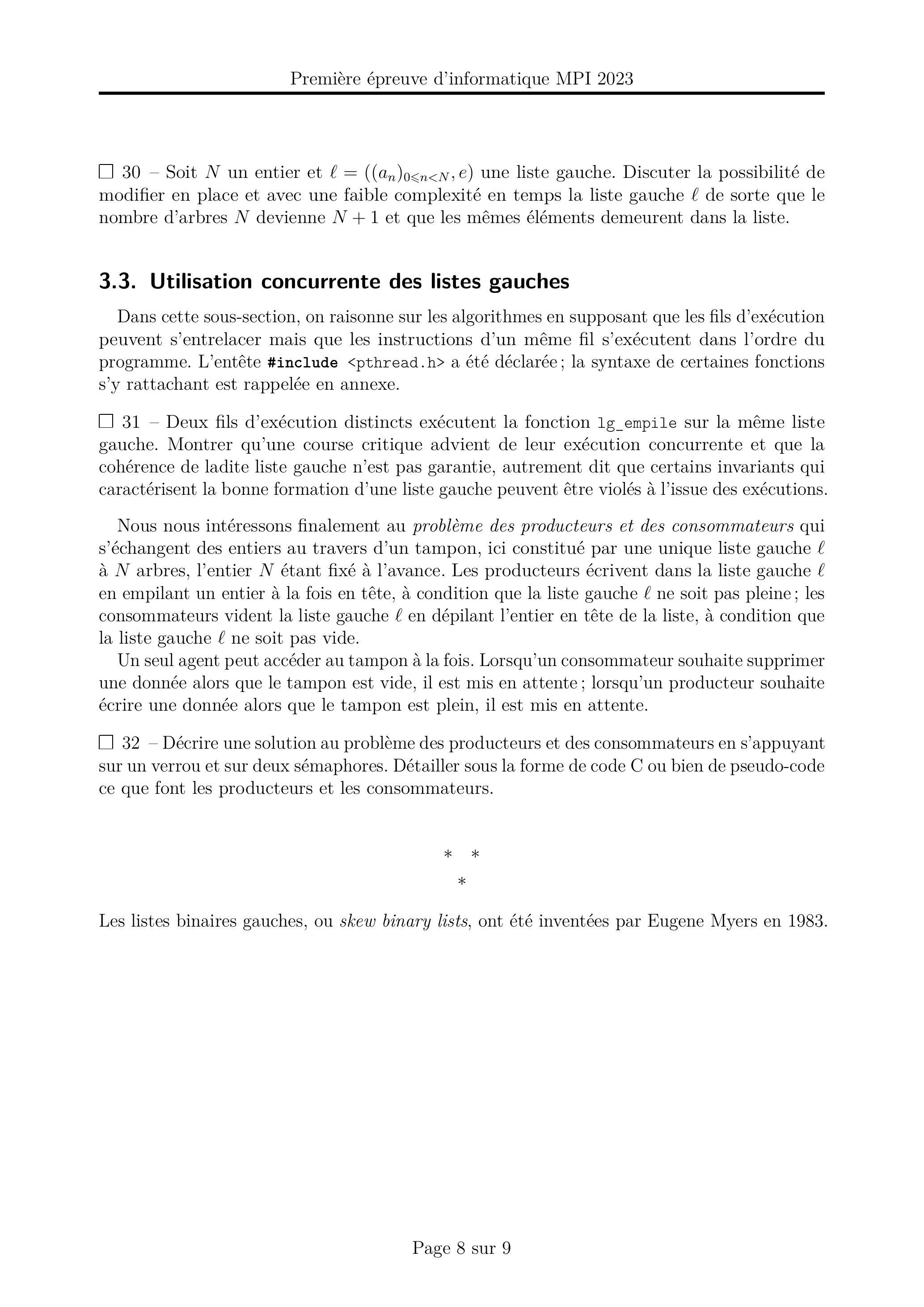 L'épreuve est composée d'un problème unique comportant 32 questions divisées en trois sections. L'objectif du problème est de construire des listes à accès direct : une liste à accès direct est un type de donnée abstrait qui permet, d'une part, d'empiler et de dépiler efficacement un élément en tête de liste et, d'autre part, d'accéder efficacement au élément de la liste, pour n'importe quel indice valide.