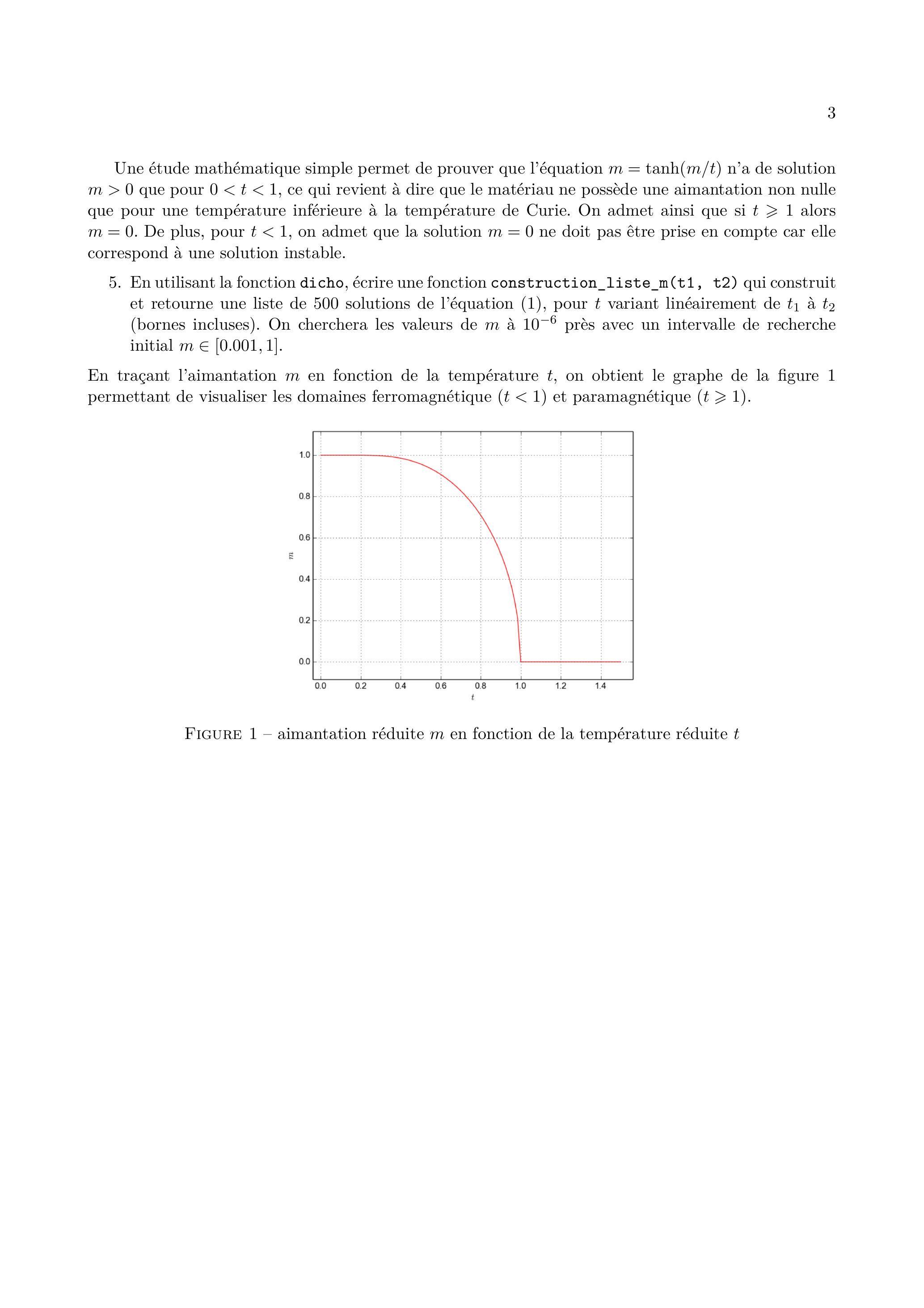 En traçant l'aimantation en fonction de la température , on obtient le graphe de la figure 1 permettant de visualiser les domaines ferromagnétique ( ) et paramagnétique ( ).