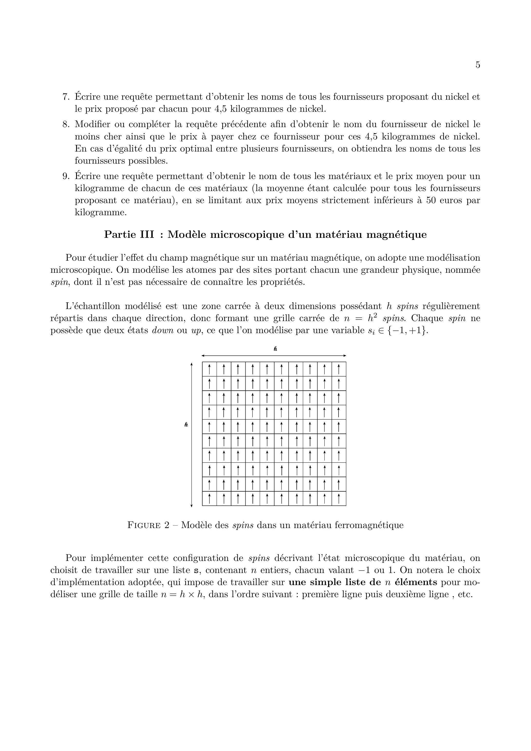 Pour implémenter cette configuration de spins décrivant l'état microscopique du matériau, on choisit de travailler sur une liste , contenant entiers, chacun valant -1 ou 1 . On notera le choix d'implémentation adoptée, qui impose de travailler sur une simple liste de éléments pour modéliser une grille de taille , dans l'ordre suivant : première ligne puis deuxième ligne, etc.