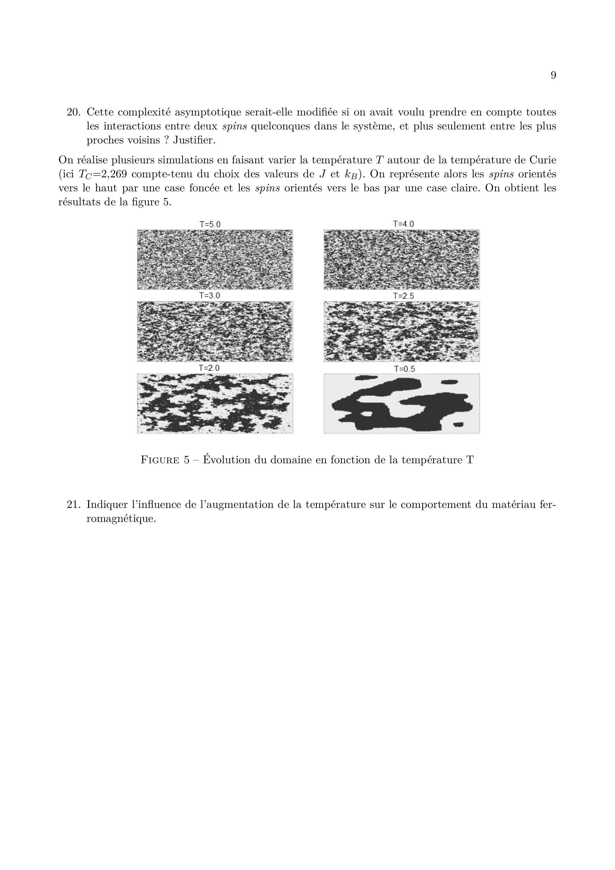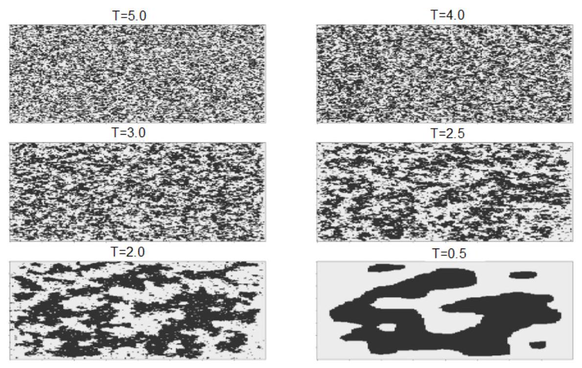 On réalise plusieurs simulations en faisant varier la température autour de la température de Curie (ici compte-tenu du choix des valeurs de et ). On représente alors les spins orientés vers le haut par une case foncée et les spins orientés vers le bas par une case claire. On obtient les résultats de la figure 5.