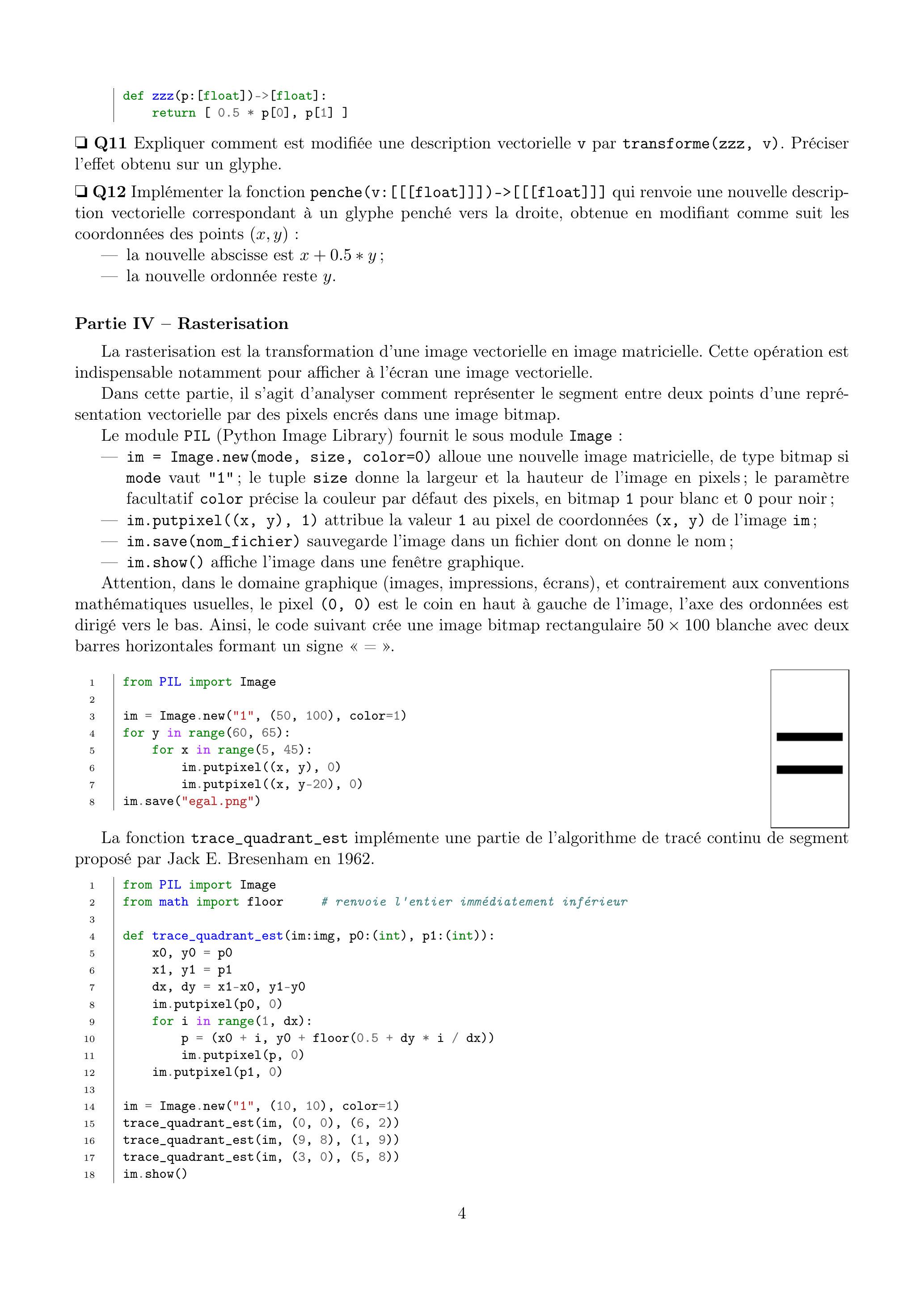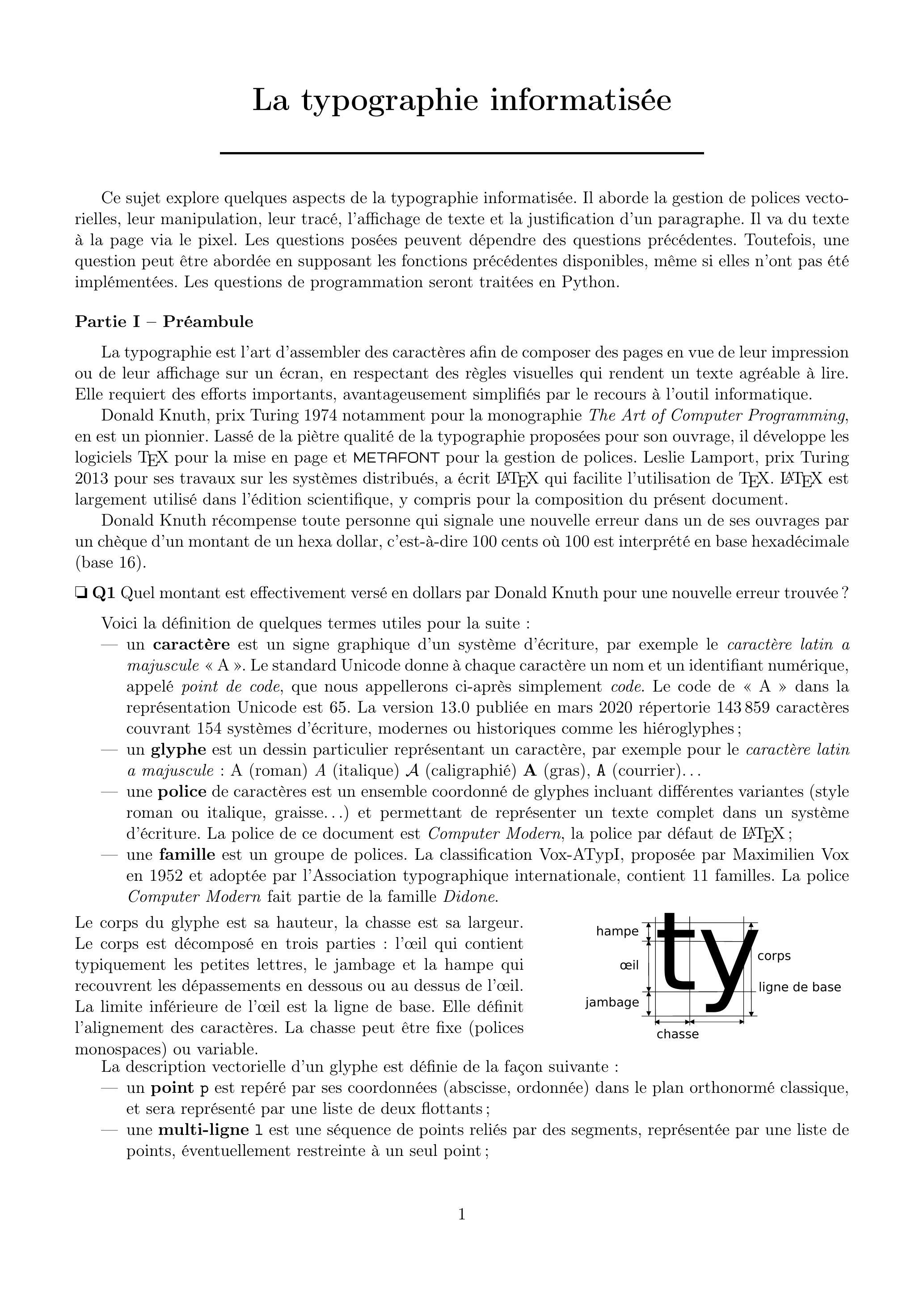 Ce sujet explore quelques aspects de la typographie informatisée. Il aborde la gestion de polices vectorielles, leur manipulation, leur tracé, l'affichage de texte et la justification d'un paragraphe. Il va du texte à la page via le pixel. Les questions posées peuvent dépendre des questions précédentes. Toutefois, une question peut être abordée en supposant les fonctions précédentes disponibles, même si elles n'ont pas été implémentées. Les questions de programmation seront traitées en Python.