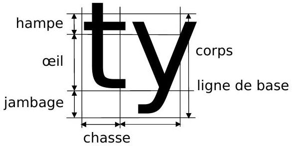 Le corps du glyphe est sa hauteur, la chasse est sa largeur. Le corps est décomposé en trois parties : l'œil qui contient typiquement les petites lettres, le jambage et la hampe qui recouvrent les dépassements en dessous ou au dessus de l'œil. La limite inférieure de l'œil est la ligne de base. Elle définit l'alignement des caractères. La chasse peut être fixe (polices