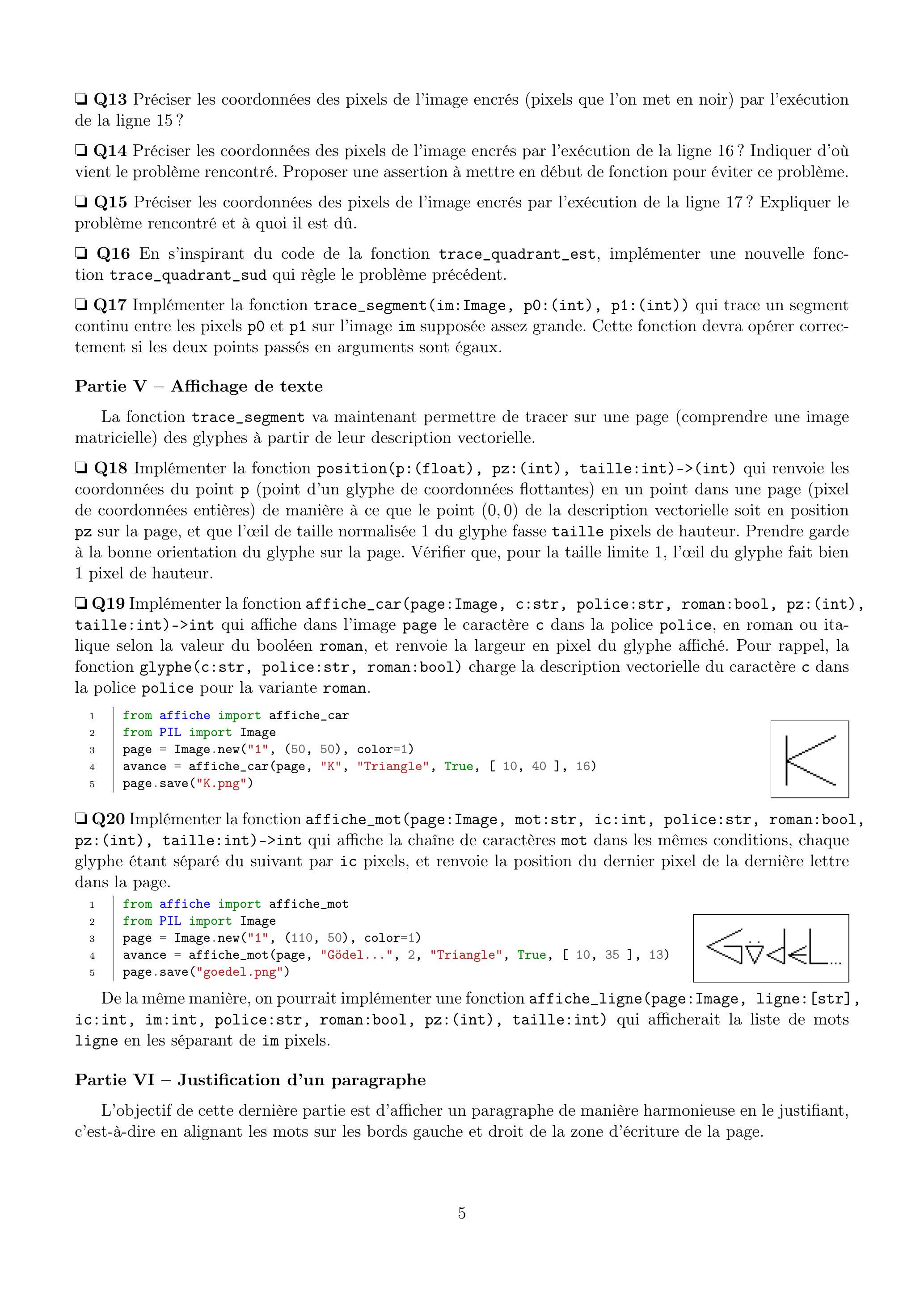 Q19 Implémenter la fonction affiche_car (page:Image, c:str, police:str, roman:bool, pz: (int), taille:int)->int qui affiche dans l'image page le caractère c dans la police police, en roman ou italique selon la valeur du booléen roman, et renvoie la largeur en pixel du glyphe affiché. Pour rappel, la fonction glyphe(c:str, police:str, roman:bool) charge la description vectorielle du caractère c dans la police police pour la variante roman.