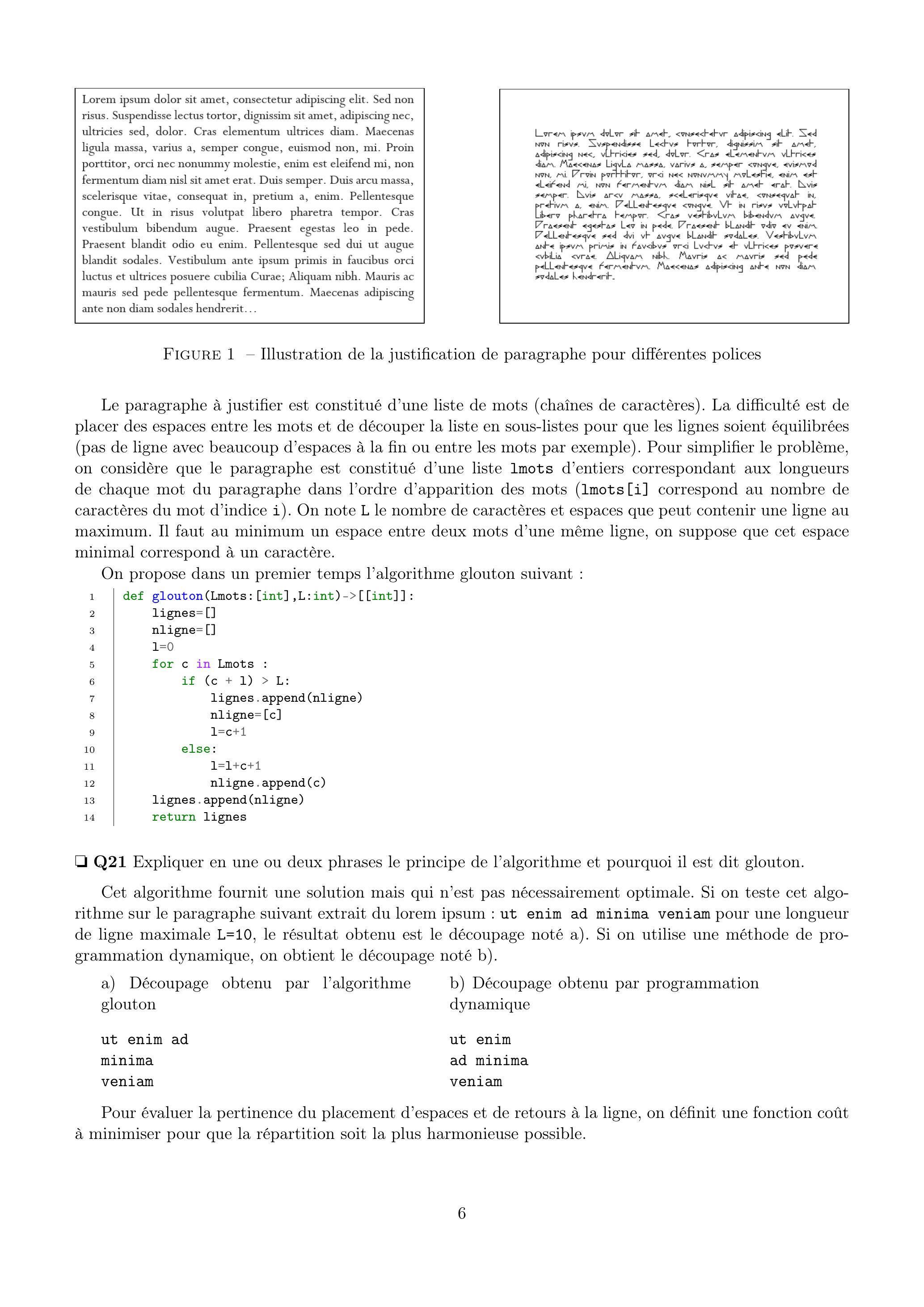 Le paragraphe à justifier est constitué d'une liste de mots (chaînes de caractères). La difficulté est de placer des espaces entre les mots et de découper la liste en sous-listes pour que les lignes soient équilibrées (pas de ligne avec beaucoup d'espaces à la fin ou entre les mots par exemple). Pour simplifier le problème, on considère que le paragraphe est constitué d'une liste lmots d'entiers correspondant aux longueurs de chaque mot du paragraphe dans l'ordre d'apparition des mots (lmots[i] correspond au nombre de caractères du mot d'indice i). On note L le nombre de caractères et espaces que peut contenir une ligne au maximum. Il faut au minimum un espace entre deux mots d'une même ligne, on suppose que cet espace minimal correspond à un caractère.
