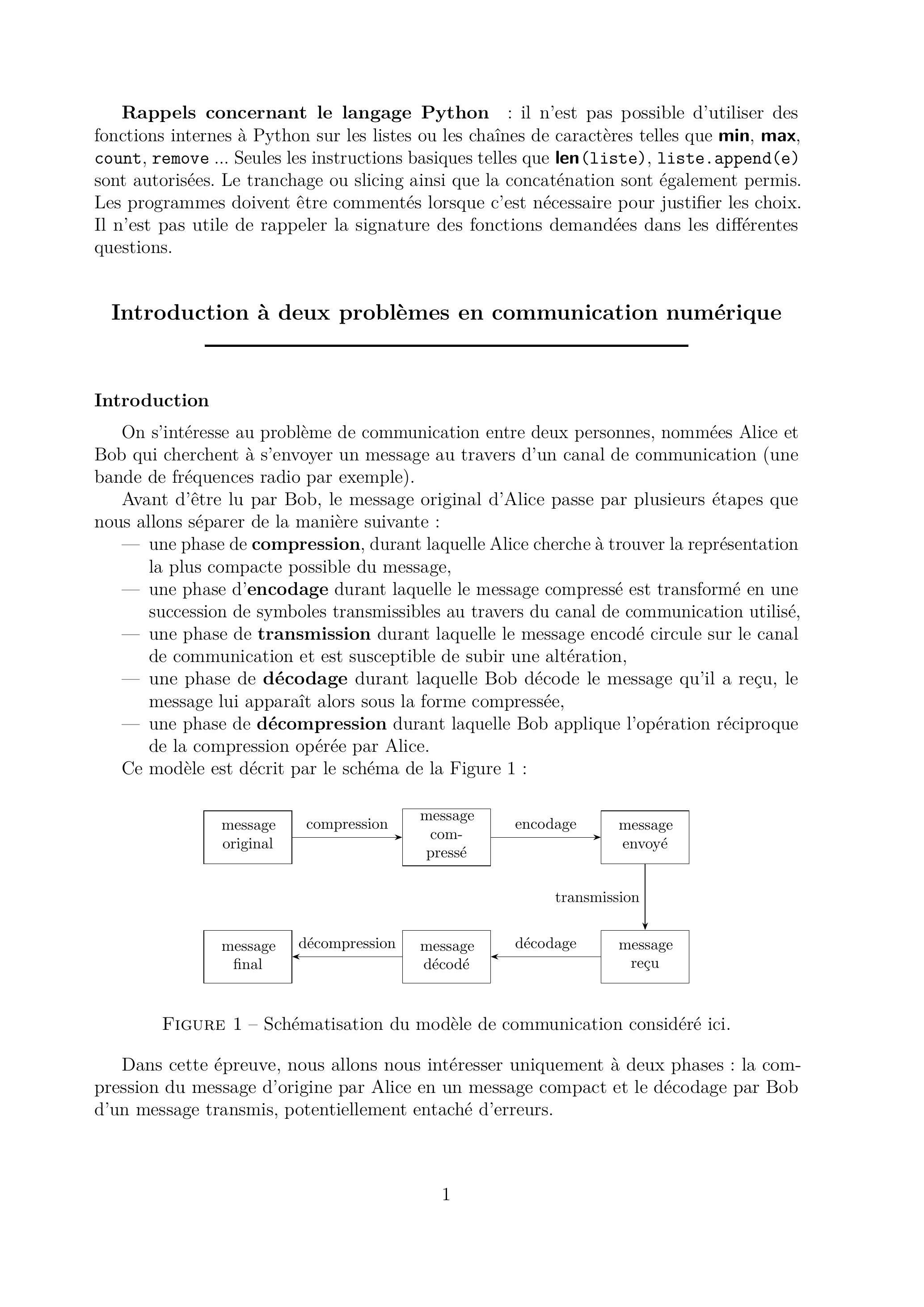 Dans cette épreuve, nous allons nous intéresser uniquement à deux phases : la compression du message d'origine par Alice en un message compact et le décodage par Bob d'un message transmis, potentiellement entaché d'erreurs.