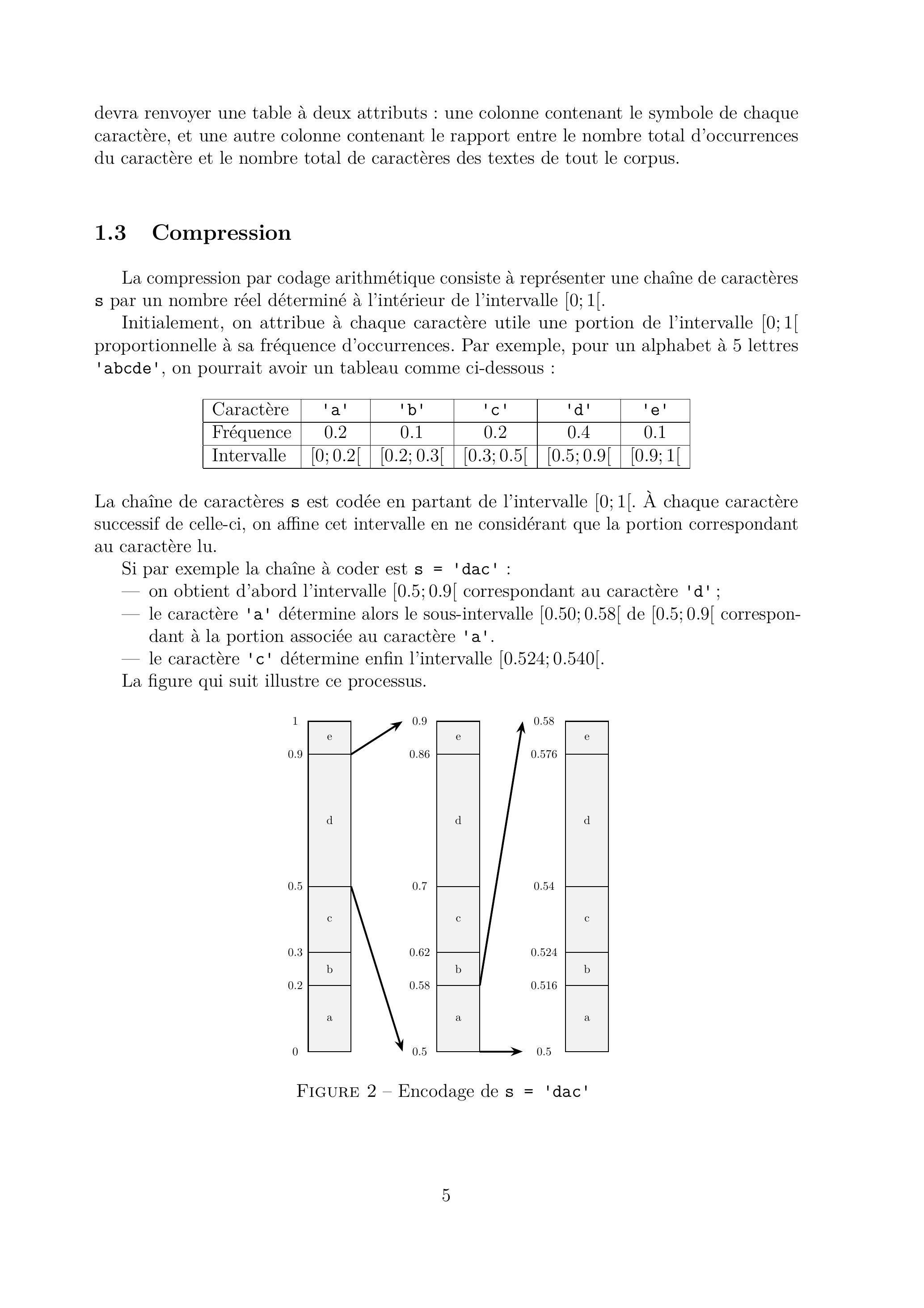 Initialement, on attribue à chaque caractère utile une portion de l'intervalle proportionnelle à sa fréquence d'occurrences. Par exemple, pour un alphabet à 5 lettres 'abcde', on pourrait avoir un tableau comme ci-dessous :