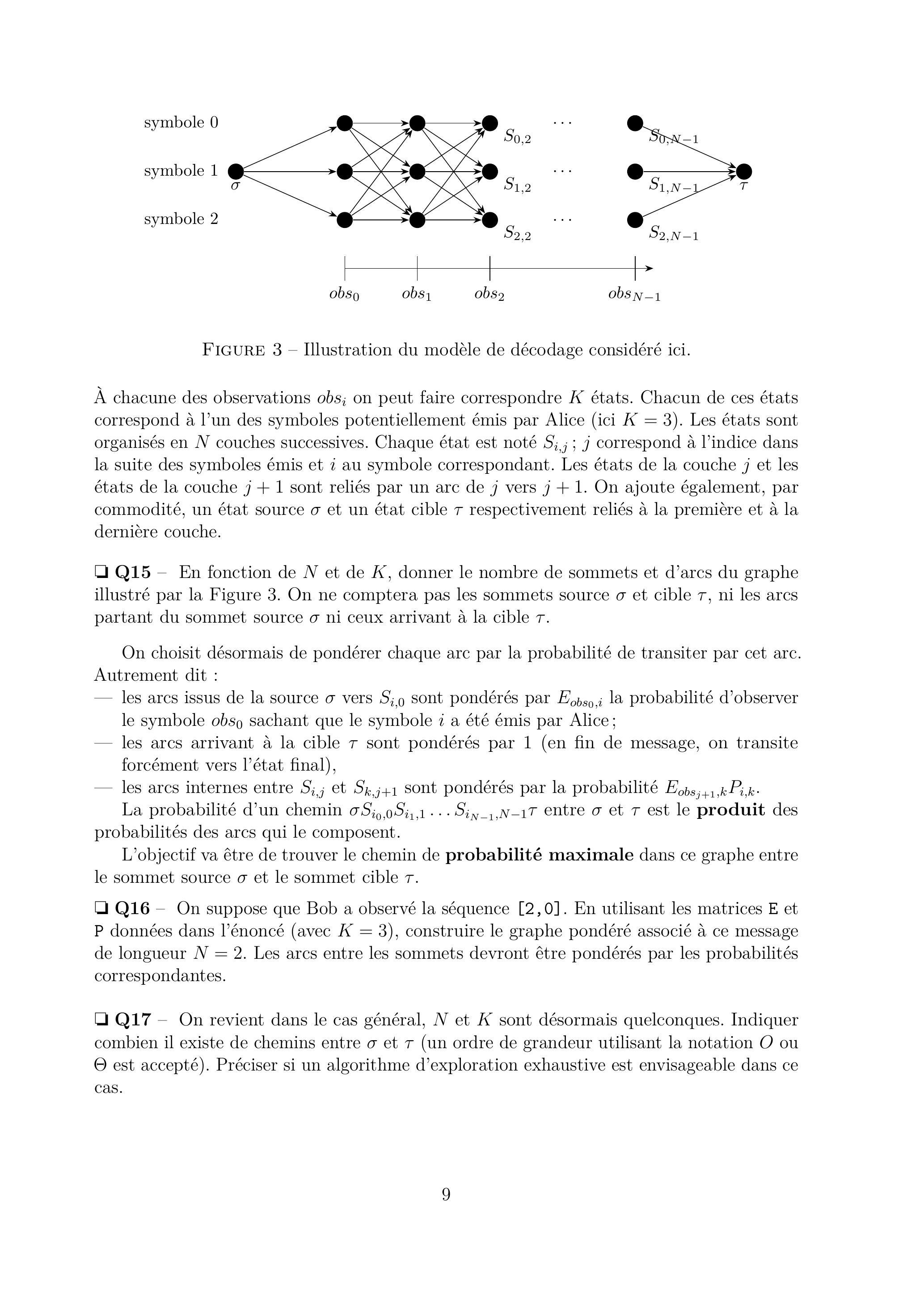 À chacune des observations on peut faire correspondre états. Chacun de ces états correspond à l'un des symboles potentiellement émis par Alice (ici ). Les états sont organisés en couches successives. Chaque état est noté correspond à l'indice dans la suite des symboles émis et au symbole correspondant. Les états de la couche et les états de la couche sont reliés par un arc de vers . On ajoute également, par commodité, un état source et un état cible respectivement reliés à la première et à la dernière couche. Q15 - En fonction de et de , donner le nombre de sommets et d'arcs du graphe illustré par la Figure 3. On ne comptera pas les sommets source et cible , ni les arcs partant du sommet source ni ceux arrivant à la cible .