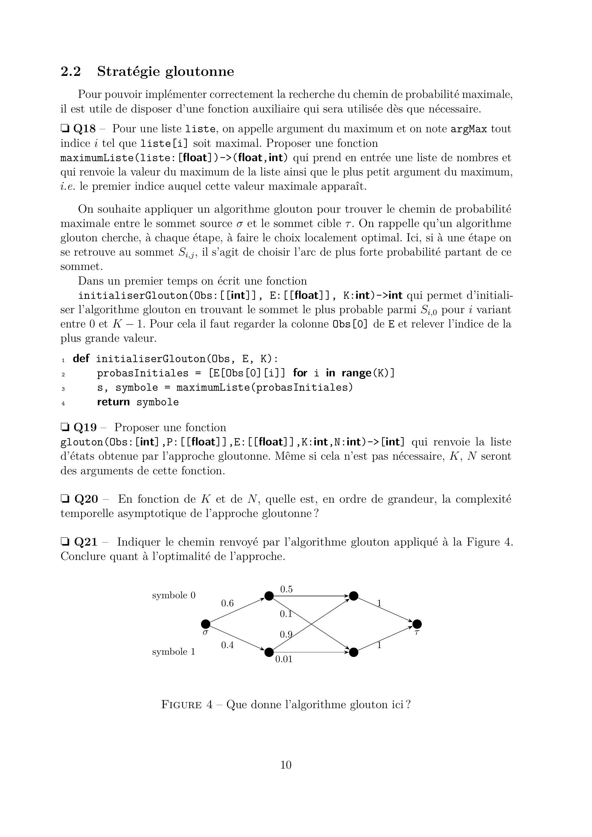 initialiserGlouton(Obs:[[int]], E:[[float]], K:int)->int qui permet d'initialiser l'algorithme glouton en trouvant le sommet le plus probable parmi pour variant entre 0 et . Pour cela il faut regarder la colonne Obs [0] de E et relever l'indice de la plus grande valeur.