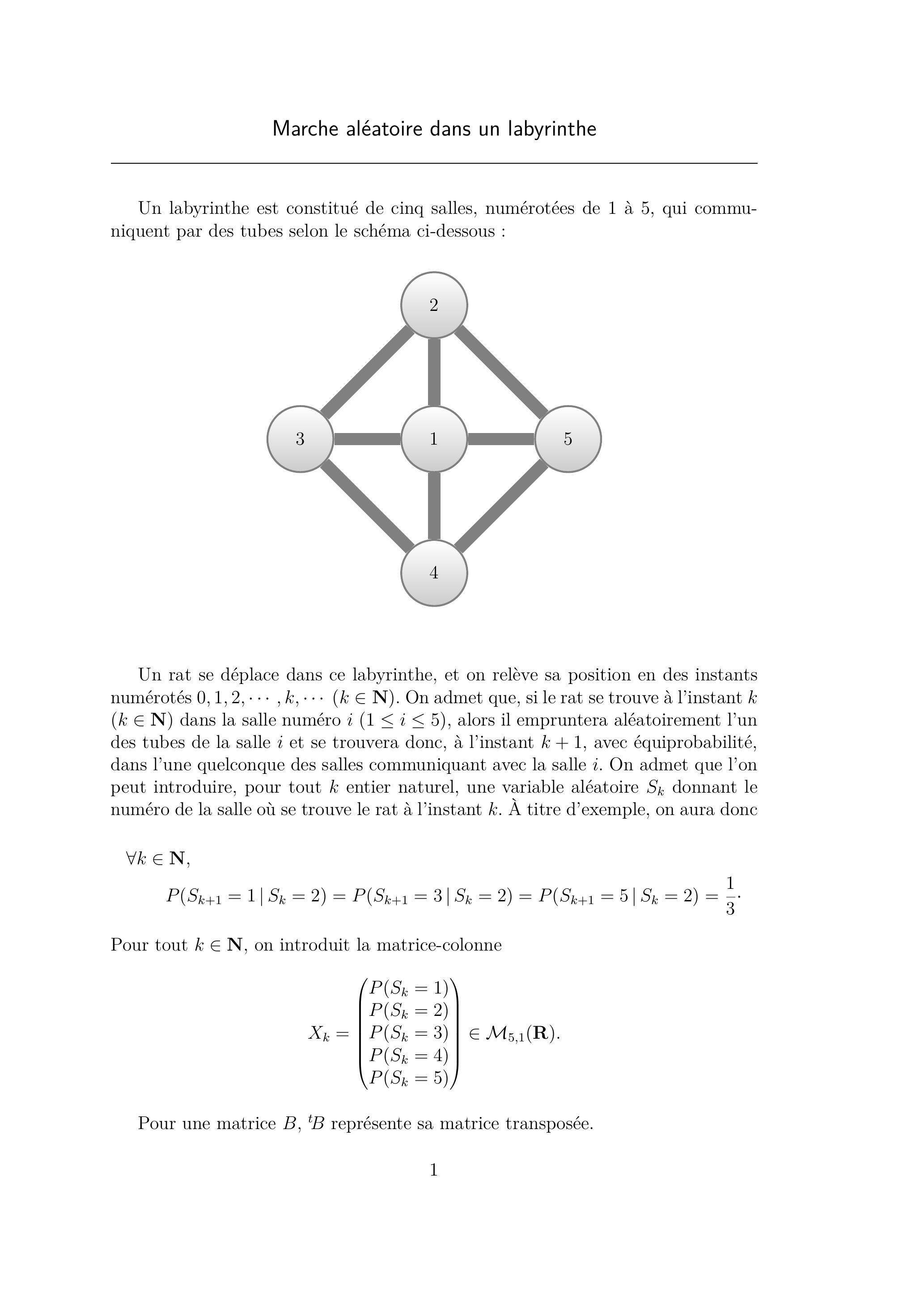 Un rat se déplace dans ce labyrinthe, et on relève sa position en des instants numérotés . On admet que, si le rat se trouve à l'instant ( ) dans la salle numéro , alors il empruntera aléatoirement l'un des tubes de la salle et se trouvera donc, à l'instant , avec équiprobabilité, dans l'une quelconque des salles communiquant avec la salle . On admet que l'on peut introduire, pour tout entier naturel, une variable aléatoire donnant le numéro de la salle où se trouve le rat à l'instant . À titre d'exemple, on aura donc