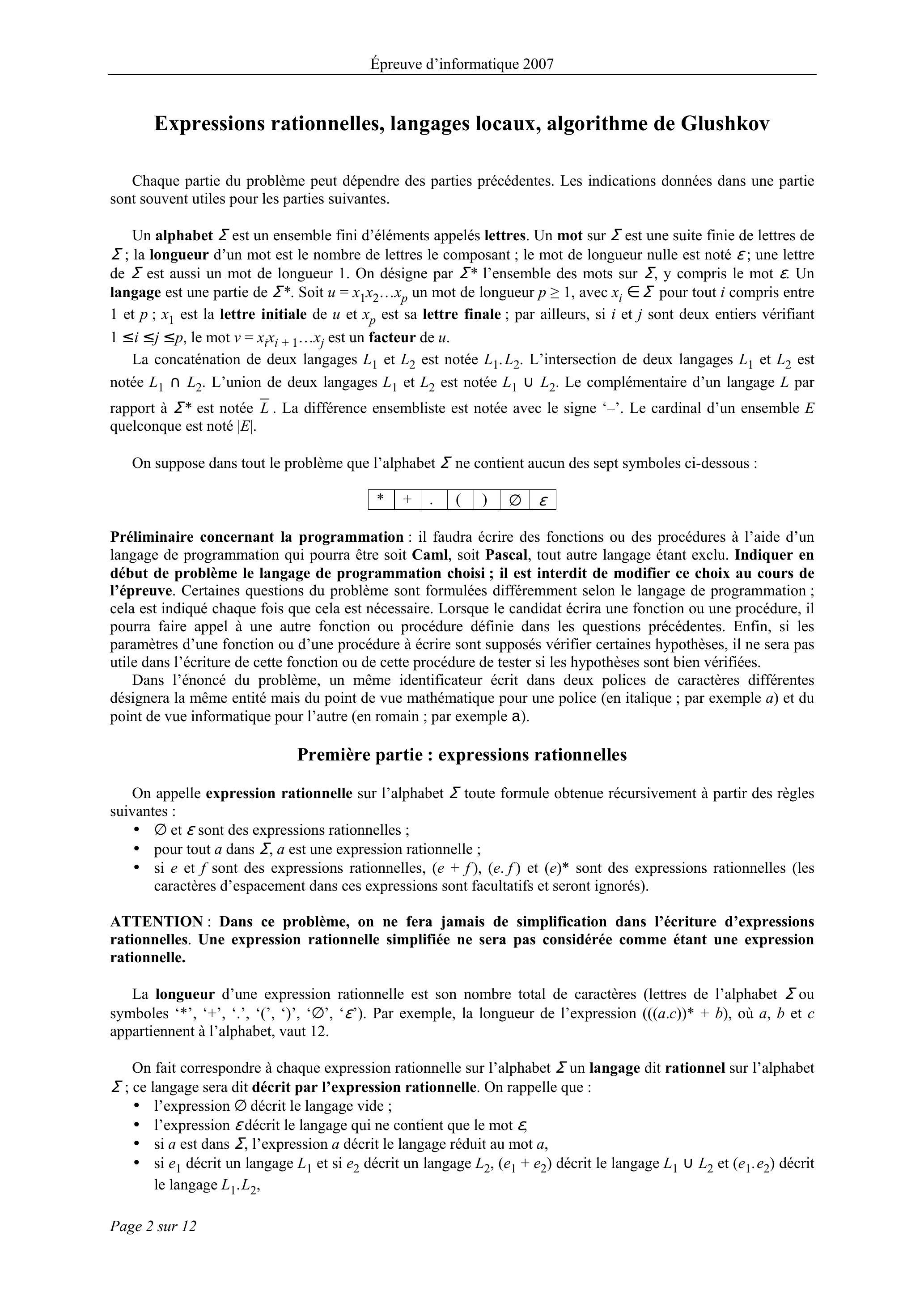 ATTENTION: dans toute la suite du problème, on ne considère que des expressions rationnelles ne contenant ni le symbole , ni le symbole , même si cela n'est pas rappelé.