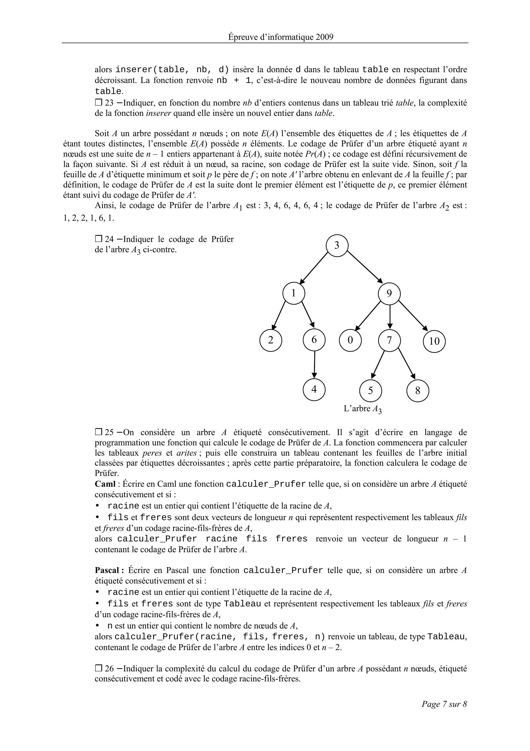 -Il s'agit d'écrire en langage de programmation une fonction calculer_arbre qui, à partir du codage de Prüfer d'un arbre étiqueté consécutivement, calcule un codage racine-fils-frères de .