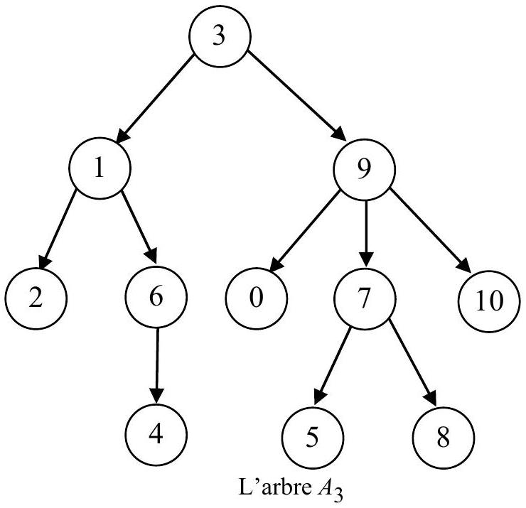 - On considère un arbre ; on suppose que l'ensemble des étiquettes de est l'arbre n'est donc pas étiqueté consécutivement ; on suppose enfin que le codage de Prüfer de est: 3, 10, 3, 7, 7, 5, 7, 5. Déterminer l'arbre . On décrira succinctement la démarche utilisée.