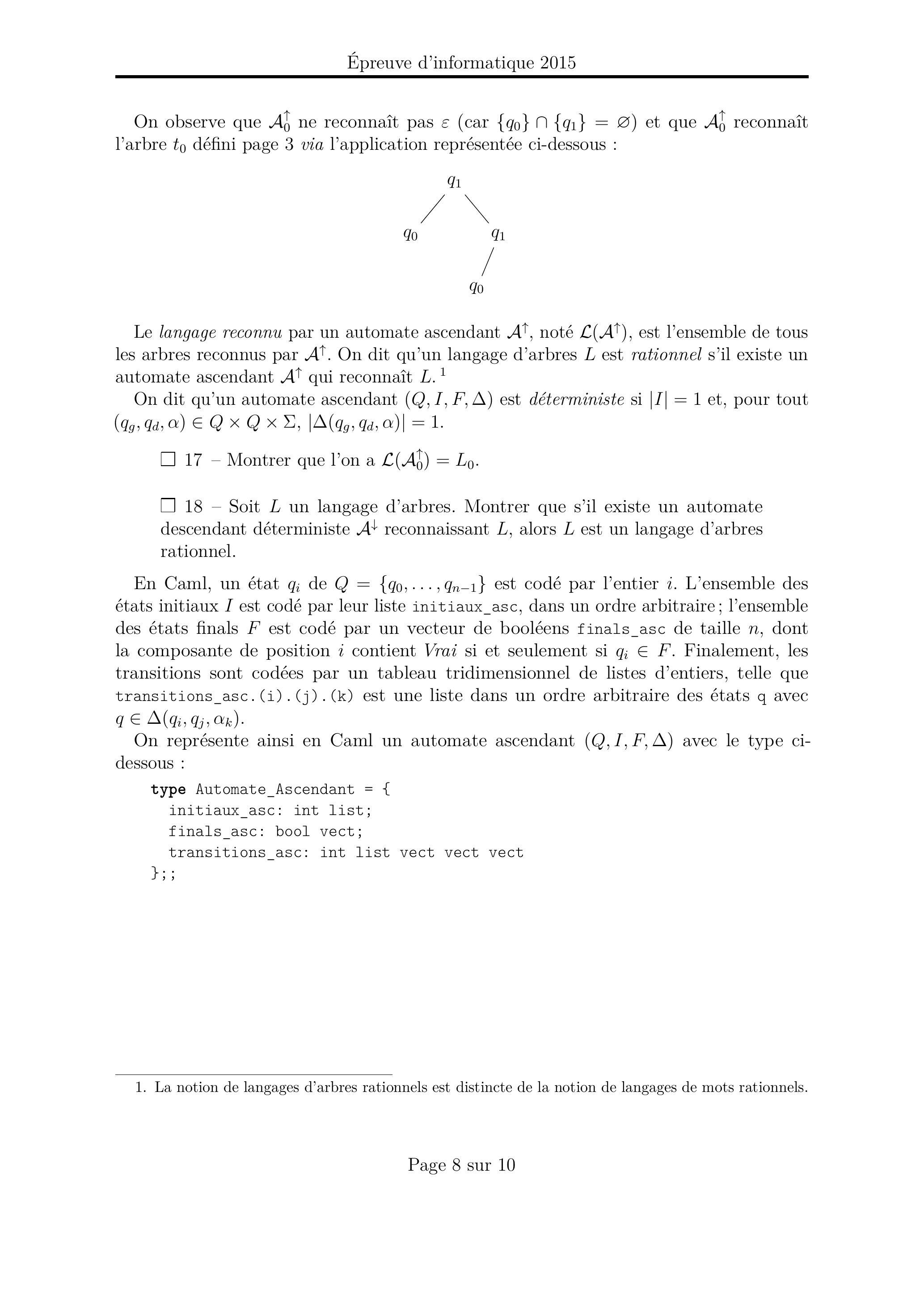 19 - Coder une fonction nombre_etats_asc prenant en argument la représentation aa d'un automate ascendant et renvoyant le nombre d'états de cet automate. - Coder une fonction nombre_symboles_asc prenant en argument la représentation aa d'un automate ascendant et renvoyant le nombre de symboles de l'alphabet sur lequel cet automate est défini. - Coder une fonction Caml applique_asc telle que applique_asc aa t, où aa représente un automate ascendant et t un arbre , renvoie une liste sans doublon des états pour lesquels il existe une application avec qui vérifie la condition (ii) de la définition de reconnaissance d'un arbre par un automate ascendant page 7. Si , la fonction applique_asc doit renvoyer la liste des états initiaux de . On pourra utiliser les fonctions utilitaires des questions 1 à 4 . - En utilisant applique_asc, coder une fonction evalue_asc telle que evalue_asc aa t, où aa représente un automate ascendant et t un arbre , renvoie un booléen qui vaut Vrai si et seulement si reconnaît . On pourra utiliser la fonction contient. - Montrer qu'un langage d'arbres est un langage d'arbres rationnel si et seulement s'il existe un automate ascendant déterministe reconnaissant . - Coder deux fonctions Caml identifiant_partie: int list -> int et partie_identifiant: int -> int list réciproques l'une de l'autre, codant une bijection entre les parties de (une partie étant représentée par une liste d'entiers sans doublon, dans un ordre arbitraire) et les entiers de 0 à . On rappelle qu'en Caml l'expression 1 lsl i calcule l'entier .