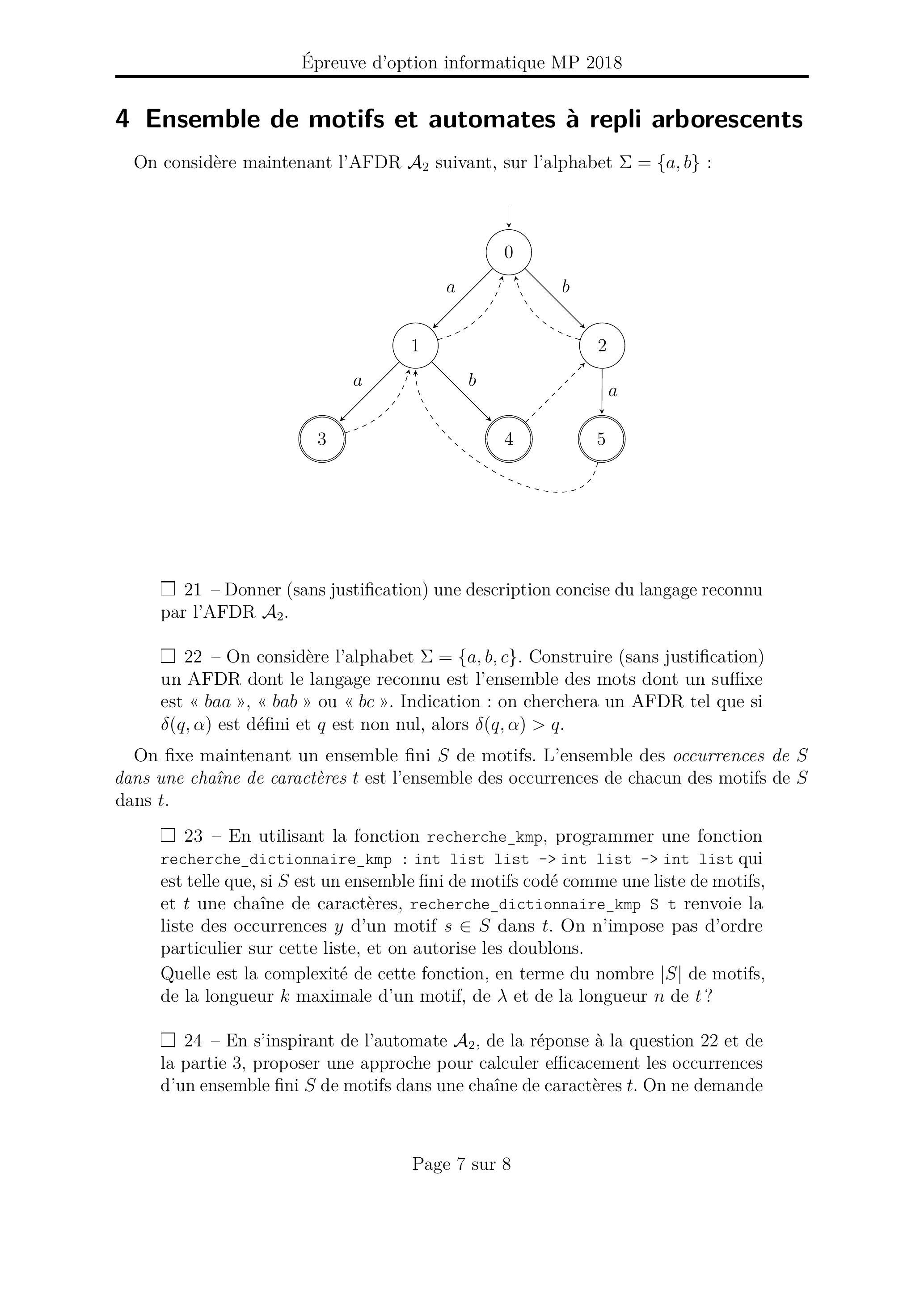 Quelle est la complexité de cette fonction, en terme du nombre de motifs, de la longueur maximale d'un motif, de et de la longueur de ? - En s'inspirant de l'automate , de la réponse à la question 22 et de la partie 3, proposer une approche pour calculer efficacement les occurrences d'un ensemble fini de motifs dans une chaîne de caractères . On ne demande