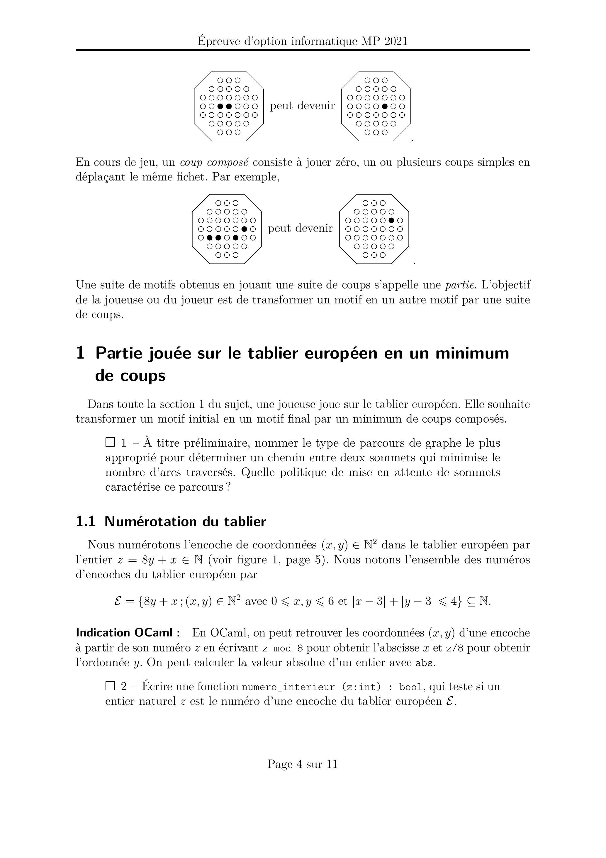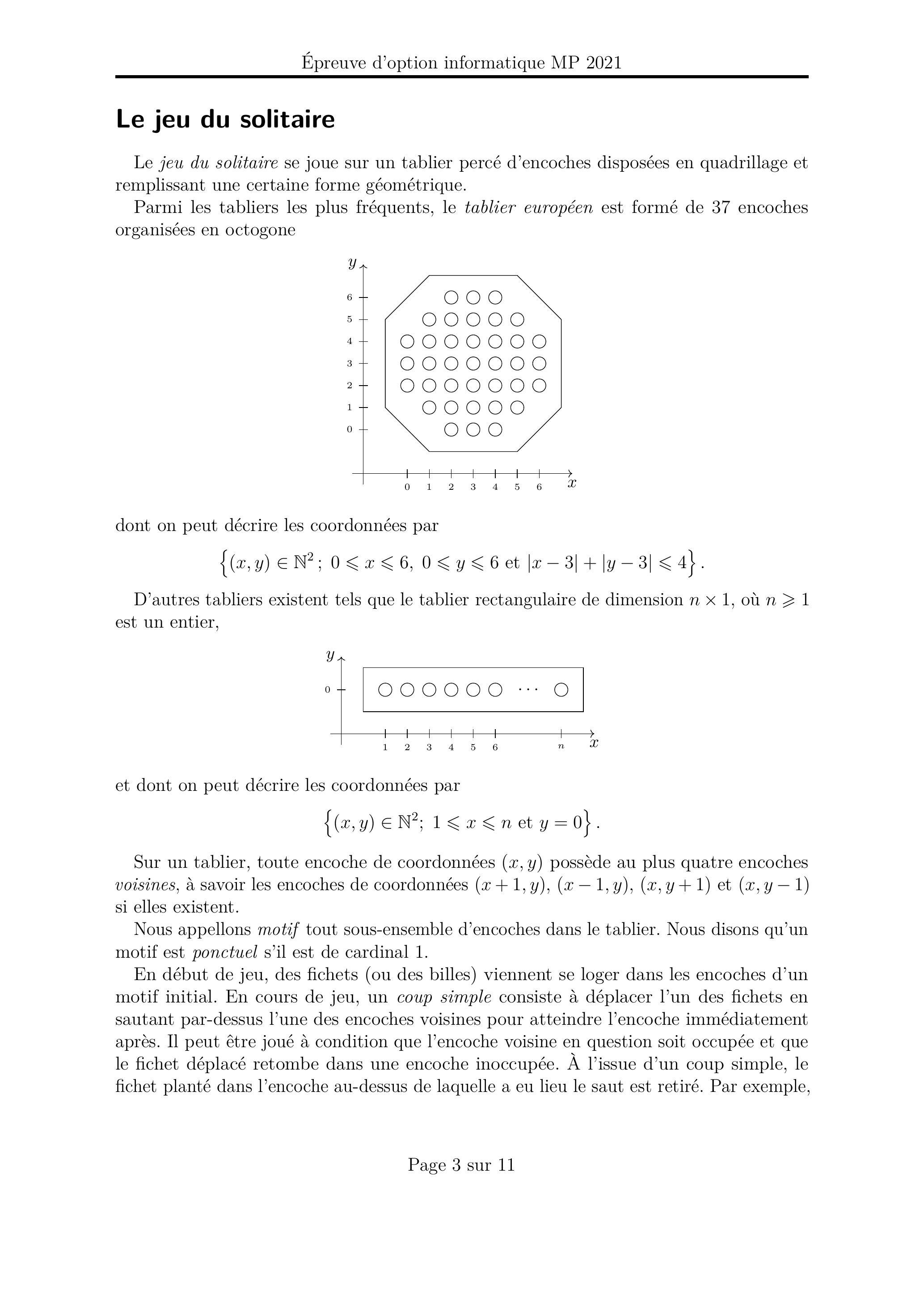 L'épreuve est composée d'un problème unique, comportant 30 questions. Après cette section de préliminaires et une section de présentation du jeu du solitaire, le problème est divisé en deux sections indépendantes, pages 4 et 8 . Dans la première section, nous étudions le jeu du solitaire sur un tablier de forme classique par des méthodes de théorie des graphes. Dans la seconde section, nous étudions le jeu du solitaire sur un tablier en bande unidimensionnelle par des méthodes de théorie des automates. Pour répondre à une question, un candidat pourra réutiliser le résultat d'une question antérieure, même s'il n'est pas parvenu à établir ce résultat.