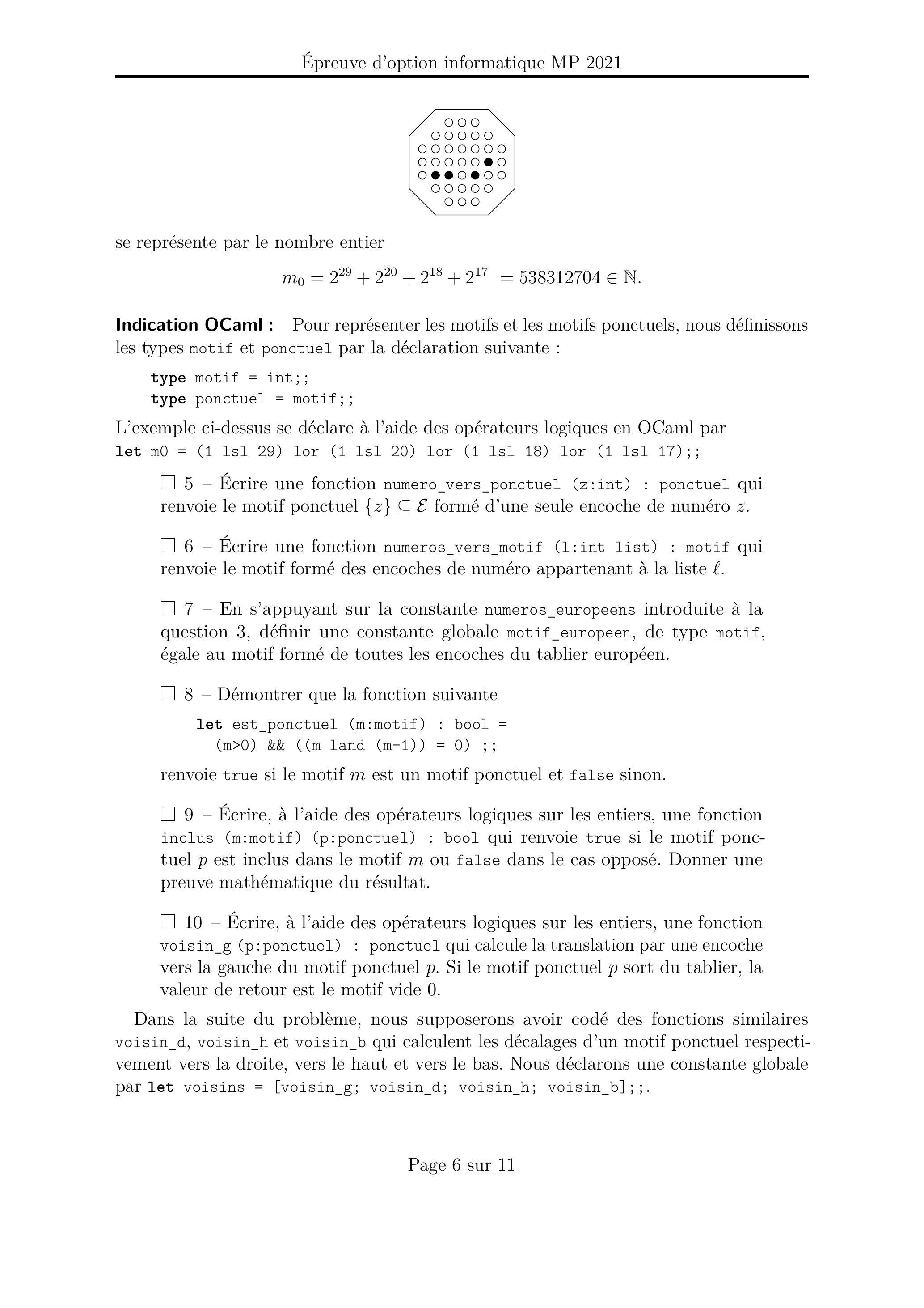 - Écrire une fonction coup_compose ((m, p) : motif * ponctuel) : (motif * ponctuel) list qui prend en entrée un motif quelconque et un motif ponctuel contenu dans et qui construit la liste des couples ( ) où est un motif obtenu à partir de à la suite du déplacement par un coup composé du fichet initialement placé dans et où est le motif ponctuel repérant le même fichet après son déplacement.