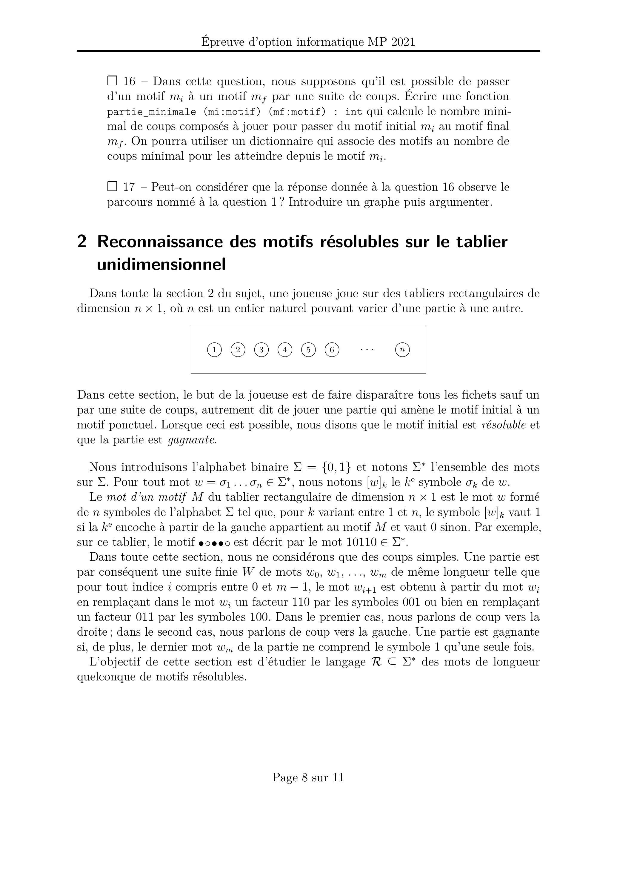 - On s'intéresse au problème de déterminer si un motif sur le tablier unidimensionnel est résoluble ou non. Montrer que l'on peut déduire de l'automate construit à la question 29 un algorithme de complexité optimale pour résoudre ce problème.