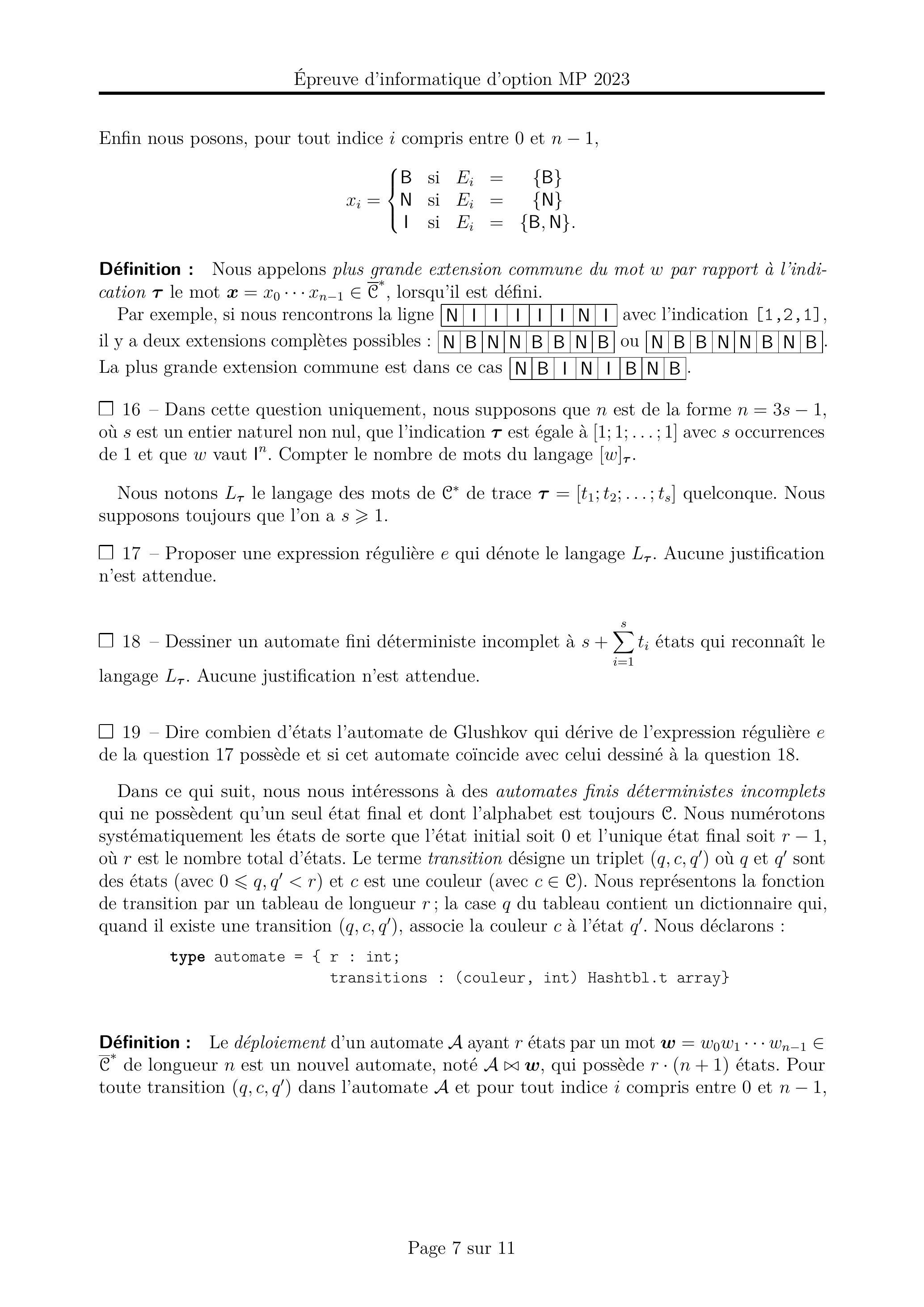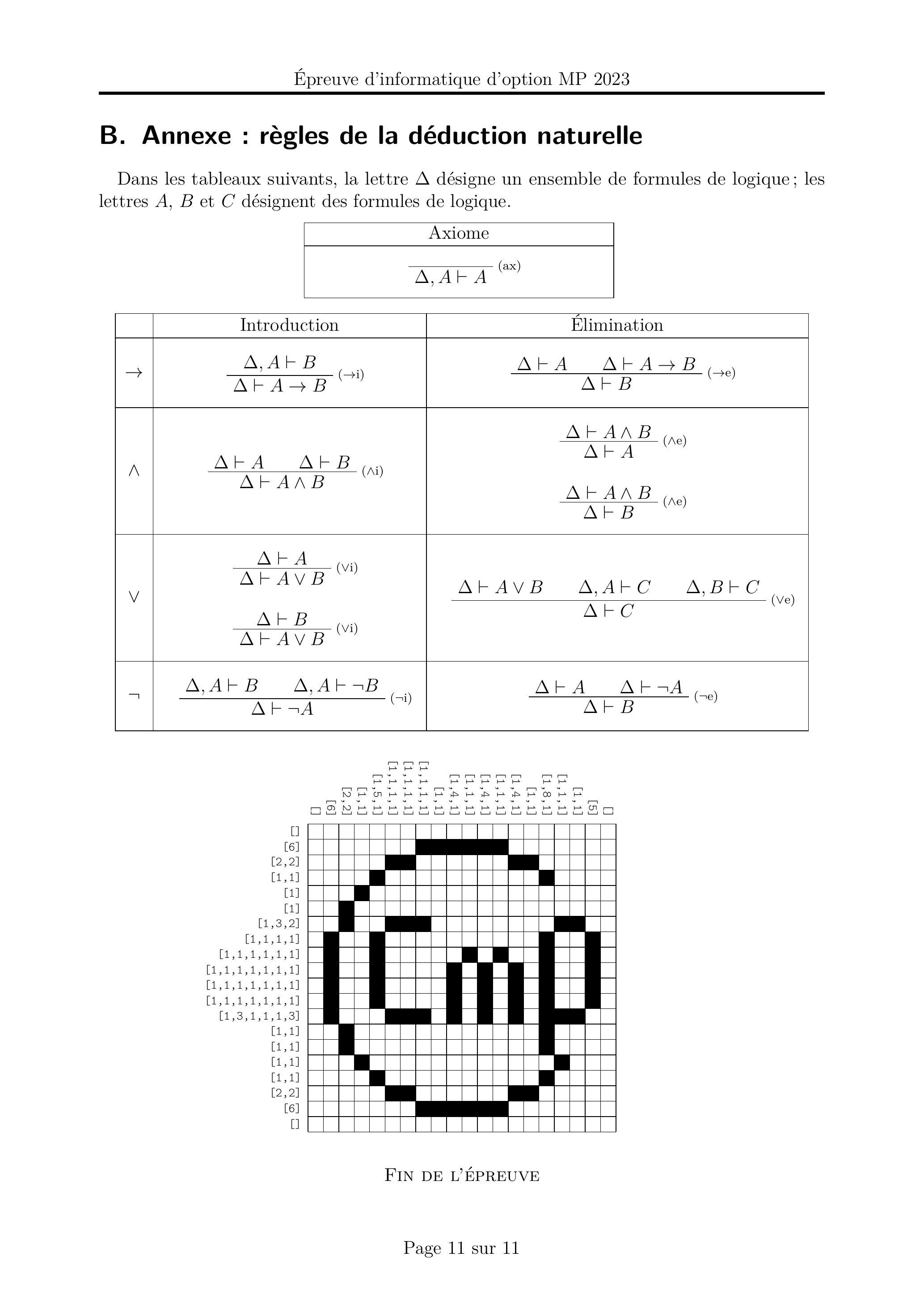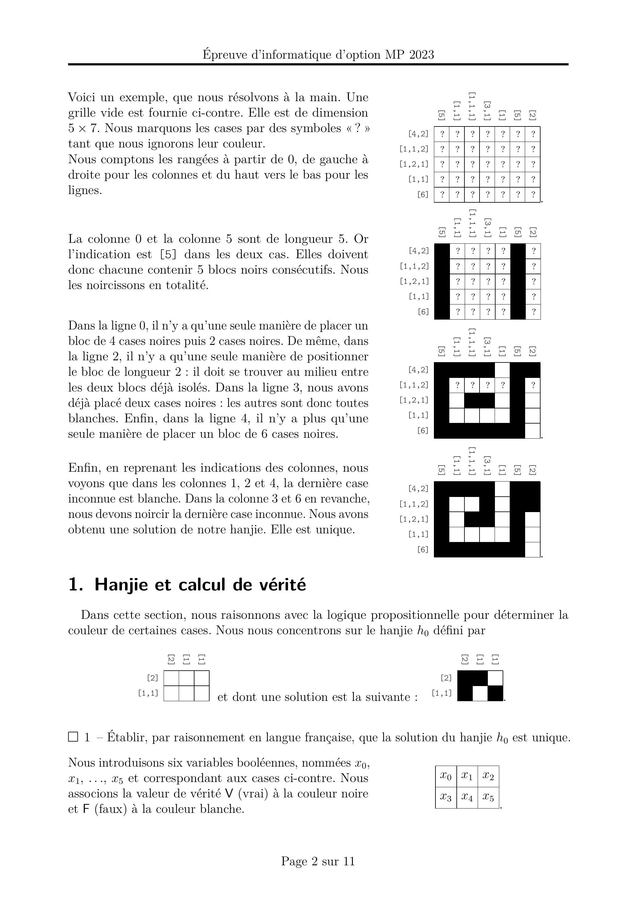 L'épreuve est composée d'un problème unique, comportant 27 questions. Après cette section de préliminaires, qui présente le jeu du hanjie, le problème est divisé en trois sections qui peuvent être traitées séparément, à condition d'avoir lu les définitions introduites jusqu'à la question traitée. Dans la première section (page 2), nous résolvons le jeu par des raisonnements logiques. Dans la deuxième section (page 3), nous modélisons le jeu et le résolvons par une stratégie algorithmique de retour sur trace. Dans la troisième section (page 6), nous appliquons une méthode de parcours de graphe en théorie des automates pour accélérer la résolution du jeu.