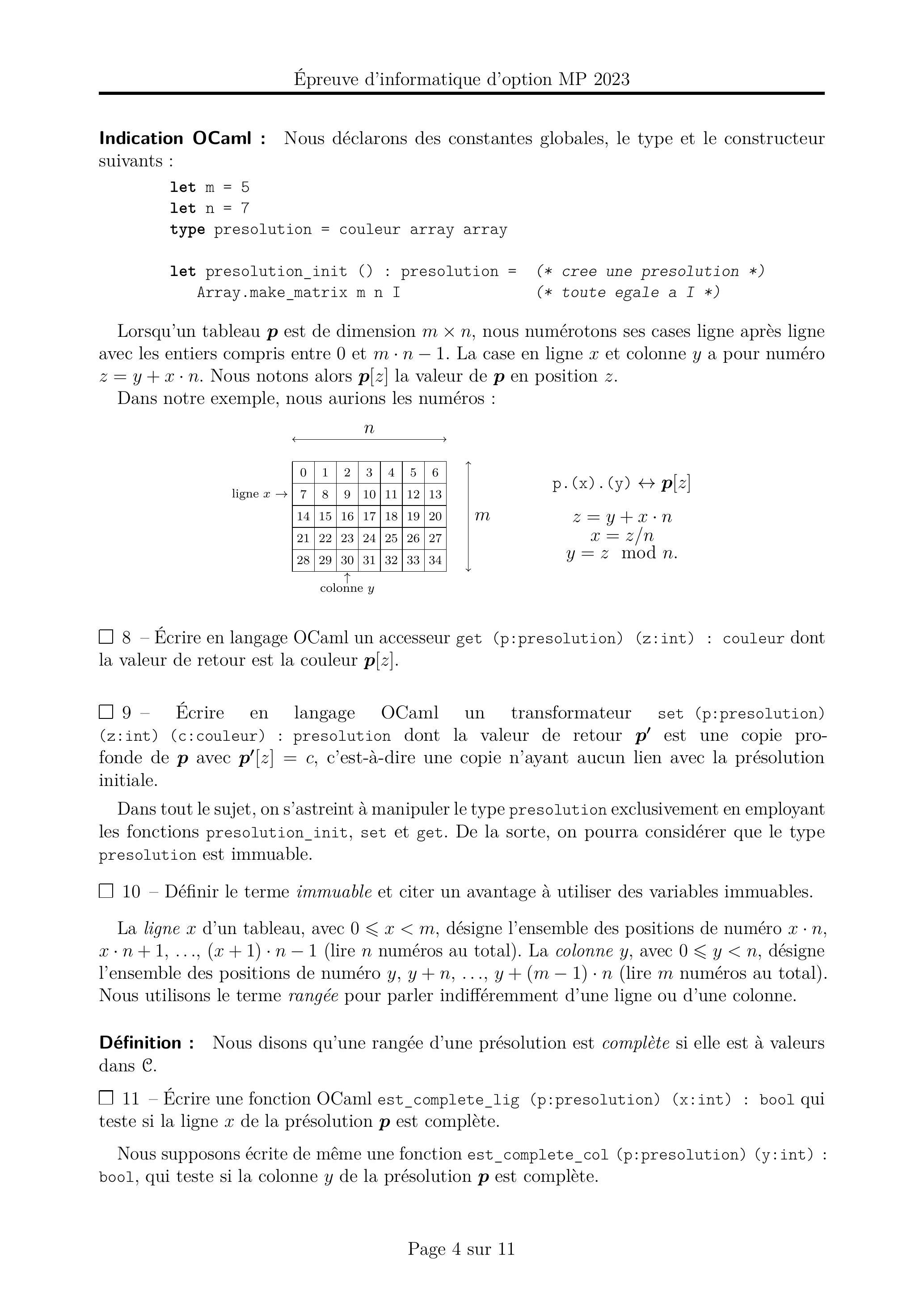 Il faudra coder des fonctions à l'aide du langage de programmation OCaml, en reprenant l'en-tête de fonction fourni par le sujet, sans s'obliger à recopier la déclaration des types. Quand l'énoncé demande de coder une fonction, sauf demande explicite de l'énoncé, il n'est pas nécessaire de justifier que celle-ci est correcte ou de vérifier que des préconditions sont satisfaites.