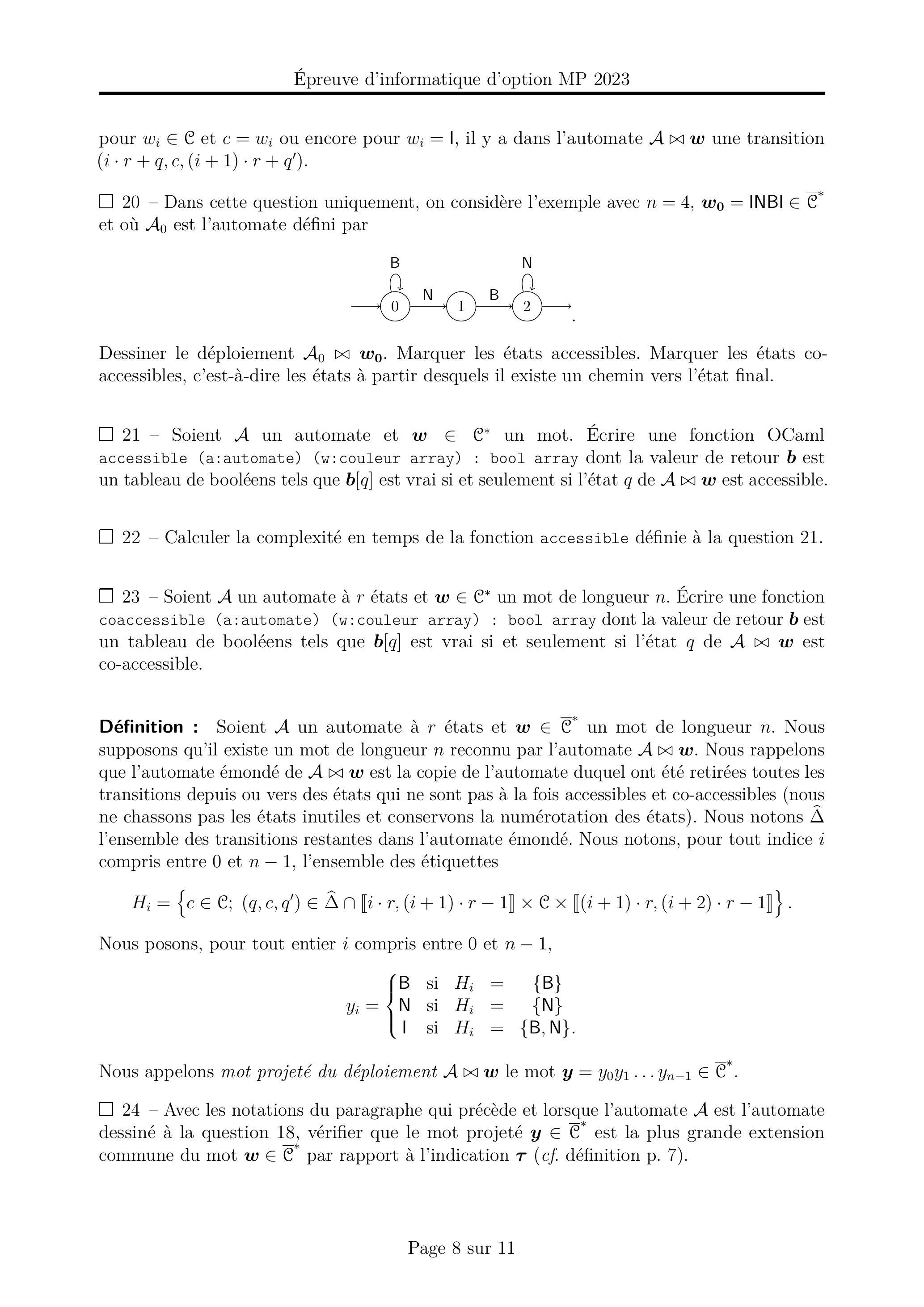 23 - Soient un automate à états et un mot de longueur . Écrire une fonction coaccessible (a:automate) (w:couleur array) : bool array dont la valeur de retour est un tableau de booléens tels que est vrai si et seulement si l'état de est co-accessible.