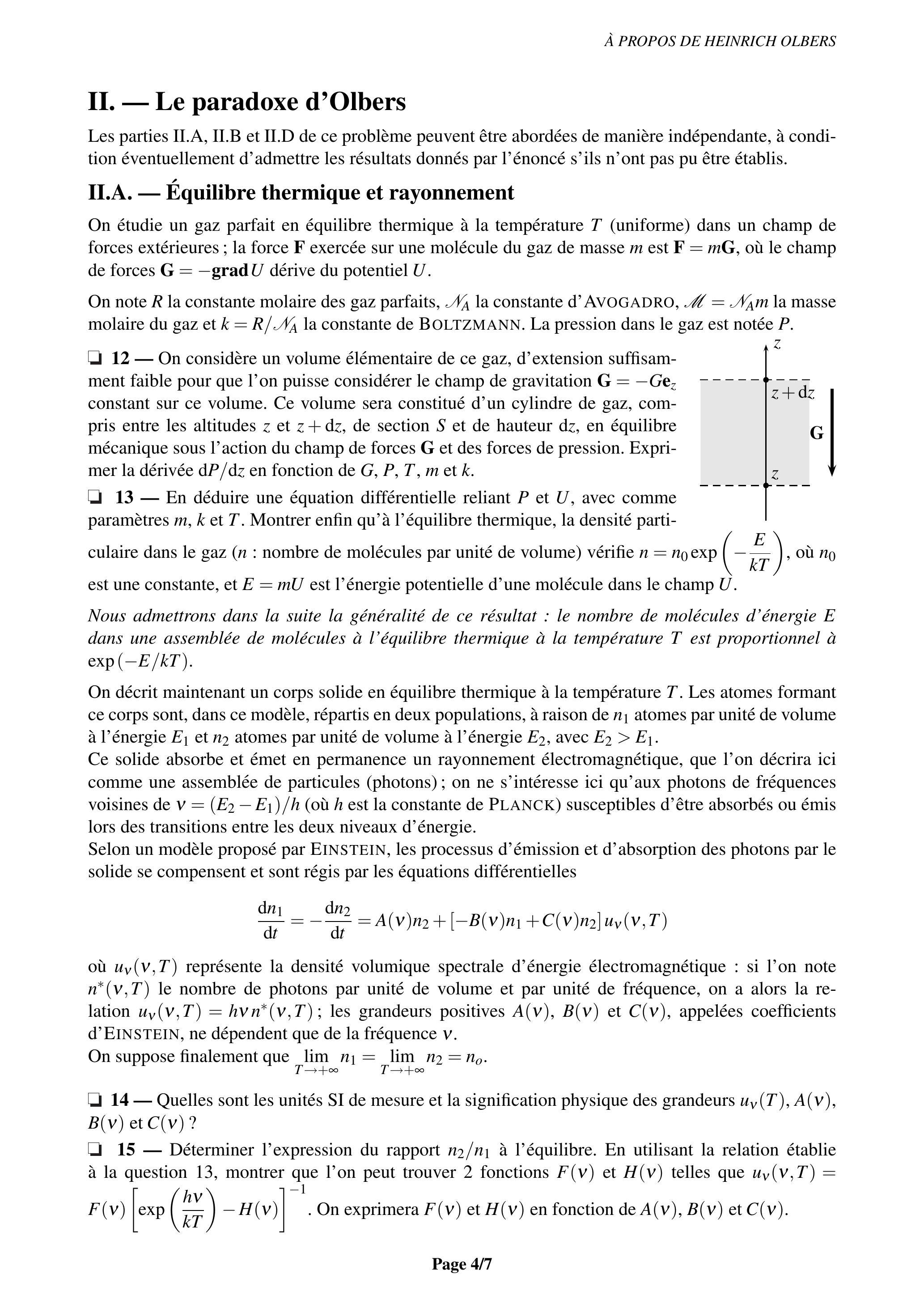 27 - En considérant toujours la cinématique classique non relativiste, montrer que l'effet DOPPLERFIZEAU permet de lever le paradoxe d'Olbers dans un univers infini. On donne ainsi que le flux surfacique moyen reçu du Soleil sur la Terre . - Le modèle du «big bang» prévoit que l'univers est âgé d'environ 13,7 milliards d'années. Montrer que dans le cadre de ce modèle et sans même considérer l'effet Doppler-Fizeau, le paradoxe d'Olbers ne tient plus. On notera la distance maximale de l'étoile observable dans le cadre du modèle du «big bang». - La longueur d'onde du maximum du rayonnement thermique du Soleil est . Les processus physiques les plus anciens observés, et donc les plus lointains, sont associés au rayonnement diffus cosmologique. Ce rayonnement a une température apparente . Quelle est la longueur d'onde apparente associée au maximum d'émission du rayonnement diffus cosmologique ? Dans quel domaine spectral se situe-t-elle ? Savez-vous quand et par qui ce rayonnement a été découvert?