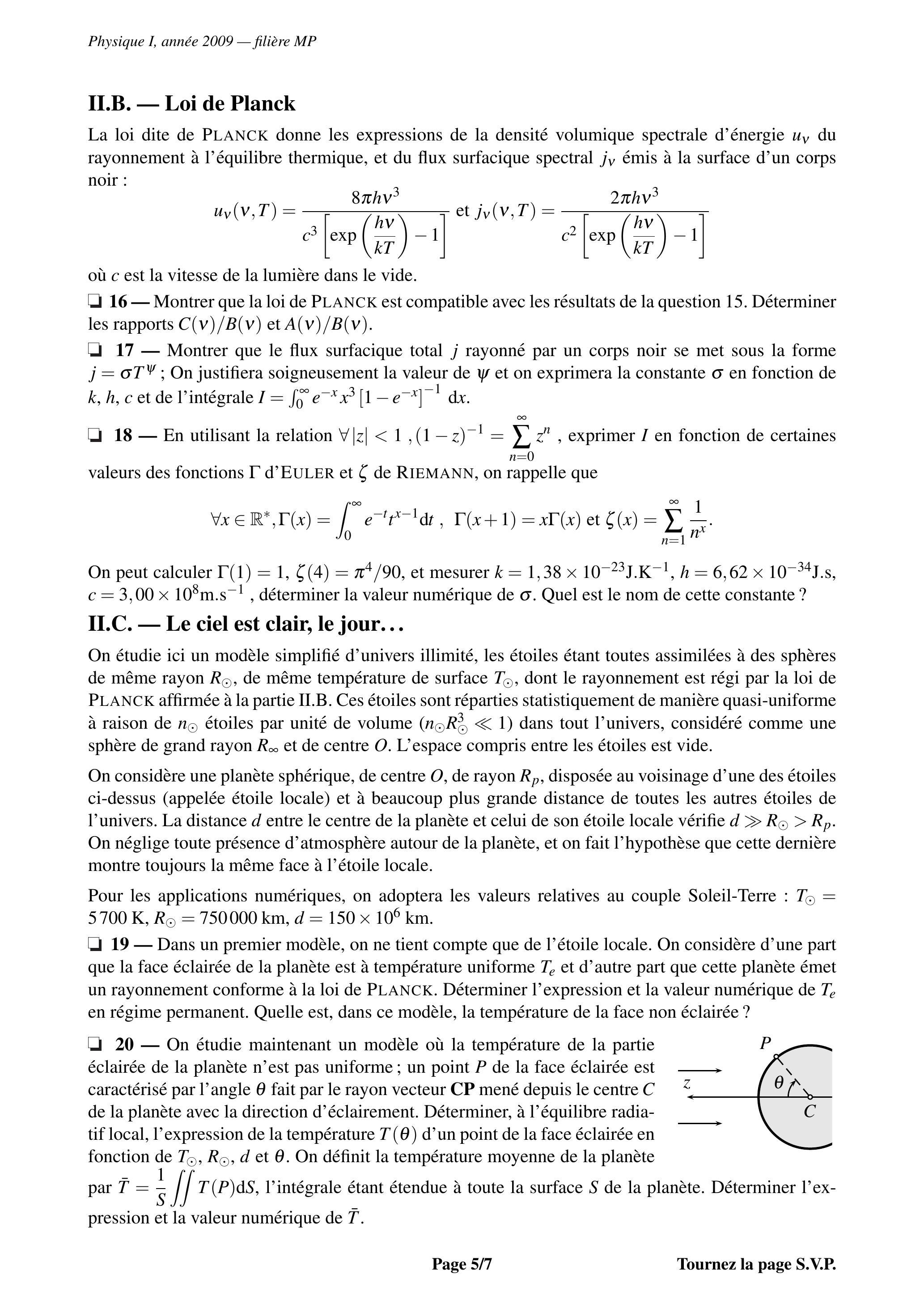 17 - Montrer que le flux surfacique total rayonné par un corps noir se met sous la forme ; On justifiera soigneusement la valeur de et on exprimera la constante en fonction de et de l'intégrale . - En utilisant la relation , exprimer en fonction de certaines valeurs des fonctions d'Euler et de Riemann, on rappelle que