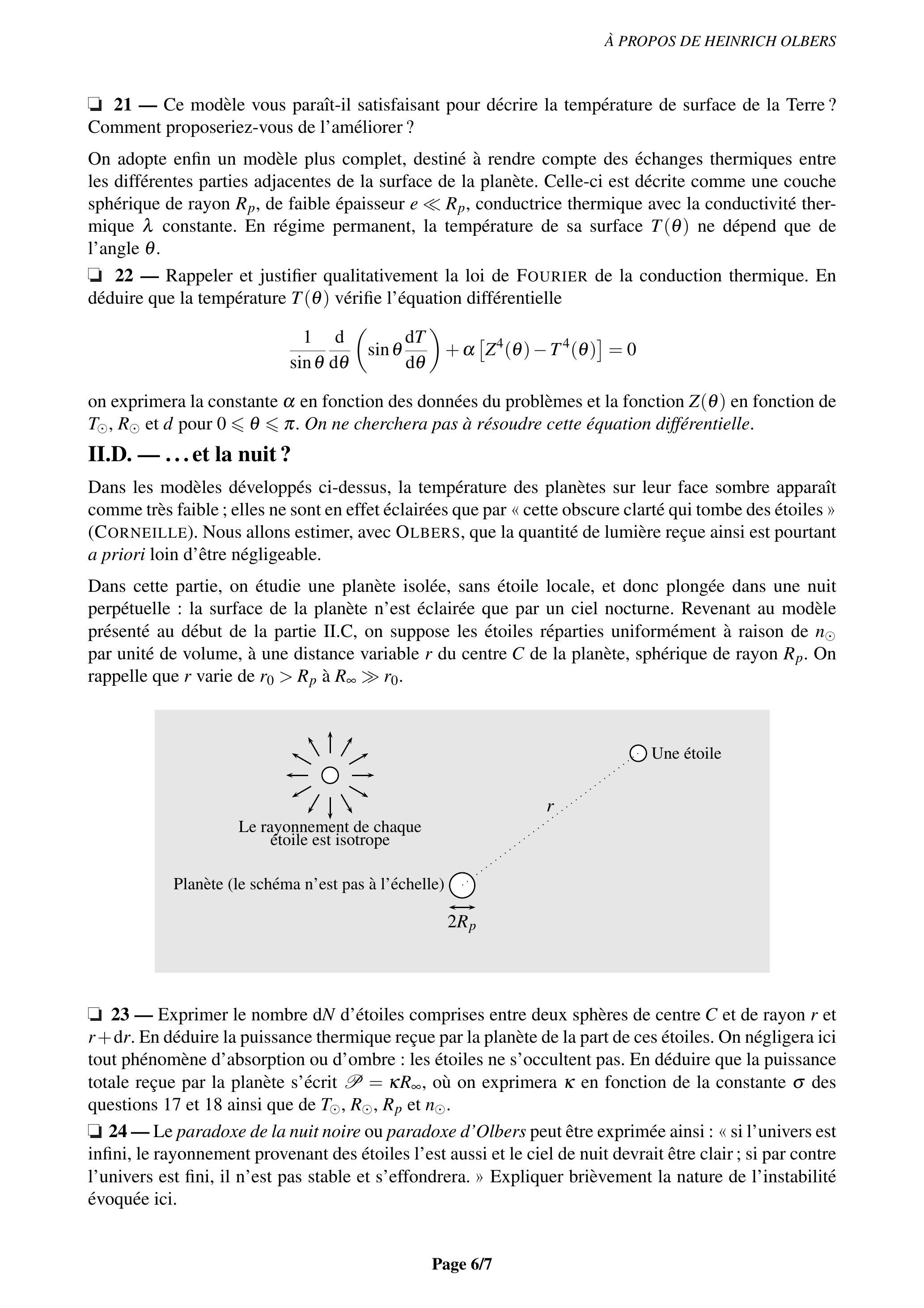 Dans cette partie, on étudie une planète isolée, sans étoile locale, et donc plongée dans une nuit perpétuelle : la surface de la planète n'est éclairée que par un ciel nocturne. Revenant au modèle présenté au début de la partie II.C, on suppose les étoiles réparties uniformément à raison de par unité de volume, à une distance variable du centre de la planète, sphérique de rayon . On rappelle que varie de à . - Exprimer le nombre d'étoiles comprises entre deux sphères de centre et de rayon et . En déduire la puissance thermique reçue par la planète de la part de ces étoiles. On négligera ici tout phénomène d'absorption ou d'ombre : les étoiles ne s'occultent pas. En déduire que la puissance totale reçue par la planète s'écrit , où on exprimera en fonction de la constante des questions 17 et 18 ainsi que de et . - Le paradoxe de la nuit noire ou paradoxe d'Olbers peut être exprimée ainsi: «si l'univers est infini, le rayonnement provenant des étoiles l'est aussi et le ciel de nuit devrait être clair; si par contre l'univers est fini, il n'est pas stable et s'effondrera. » Expliquer brièvement la nature de l'instabilité évoquée ici.