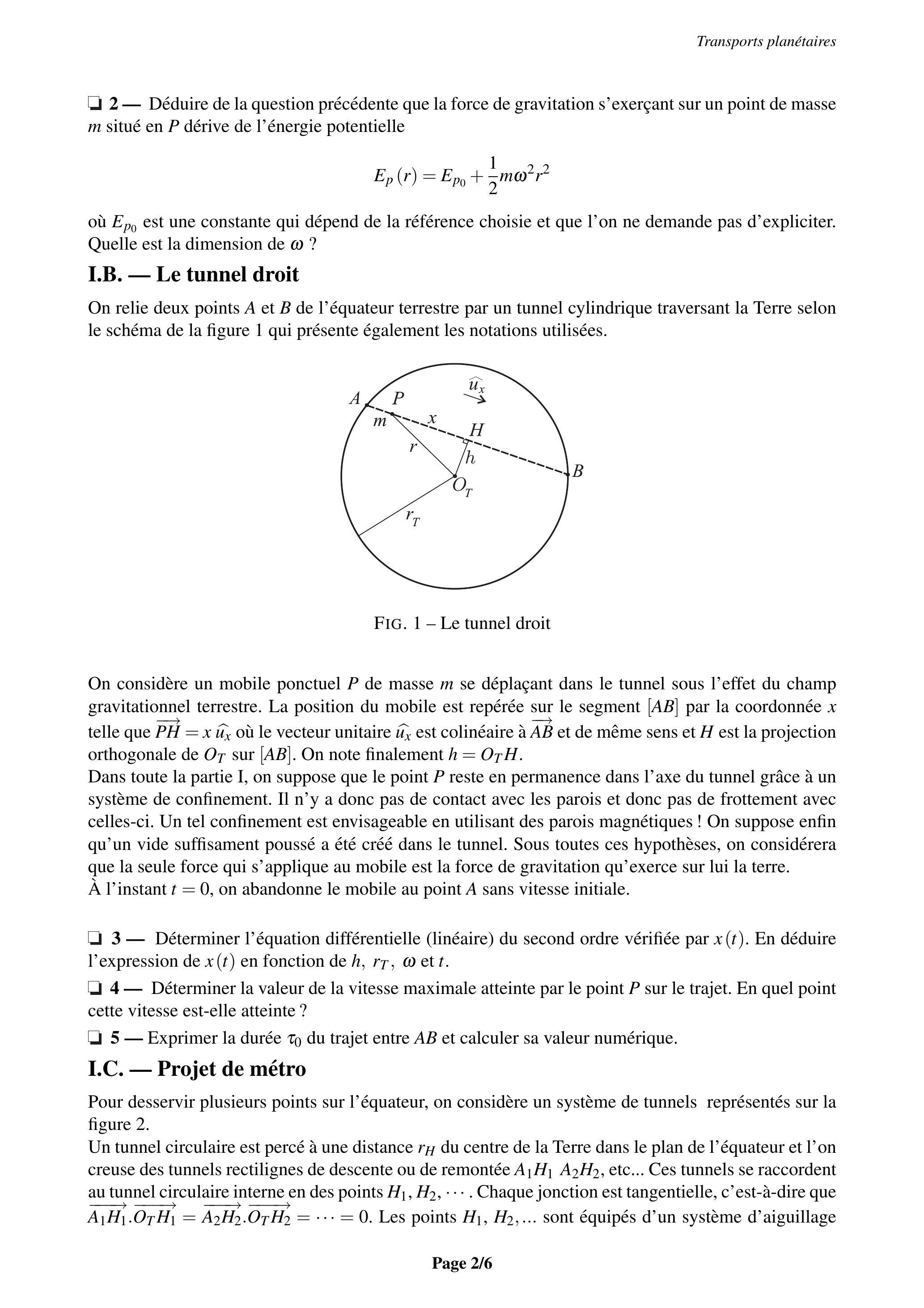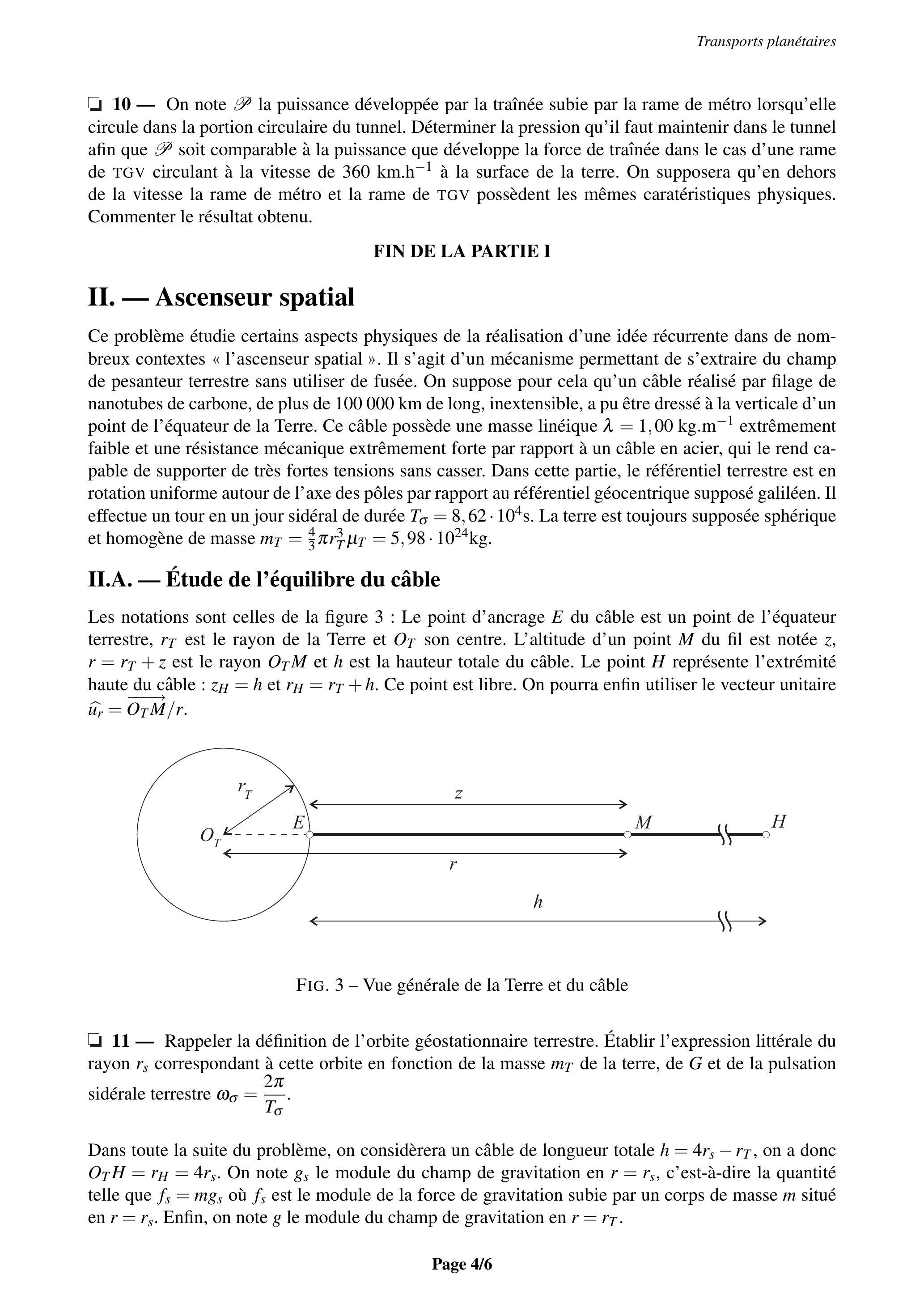 Ce problème étudie divers aspects physiques du voyage à l'échelle planétaire. Il est composé de deux parties indépendantes, la première envisage le déplacement d'un train dans un tunnel creusé dans la sphère terrestre, la seconde étudie la montée d'un ascenseur le long d'un câble vertical fixé à l'équateur. Dans tout le problème la Terre est assimilée à un corps sphérique homogène de rayon , de centre et de masse volumique homogène .