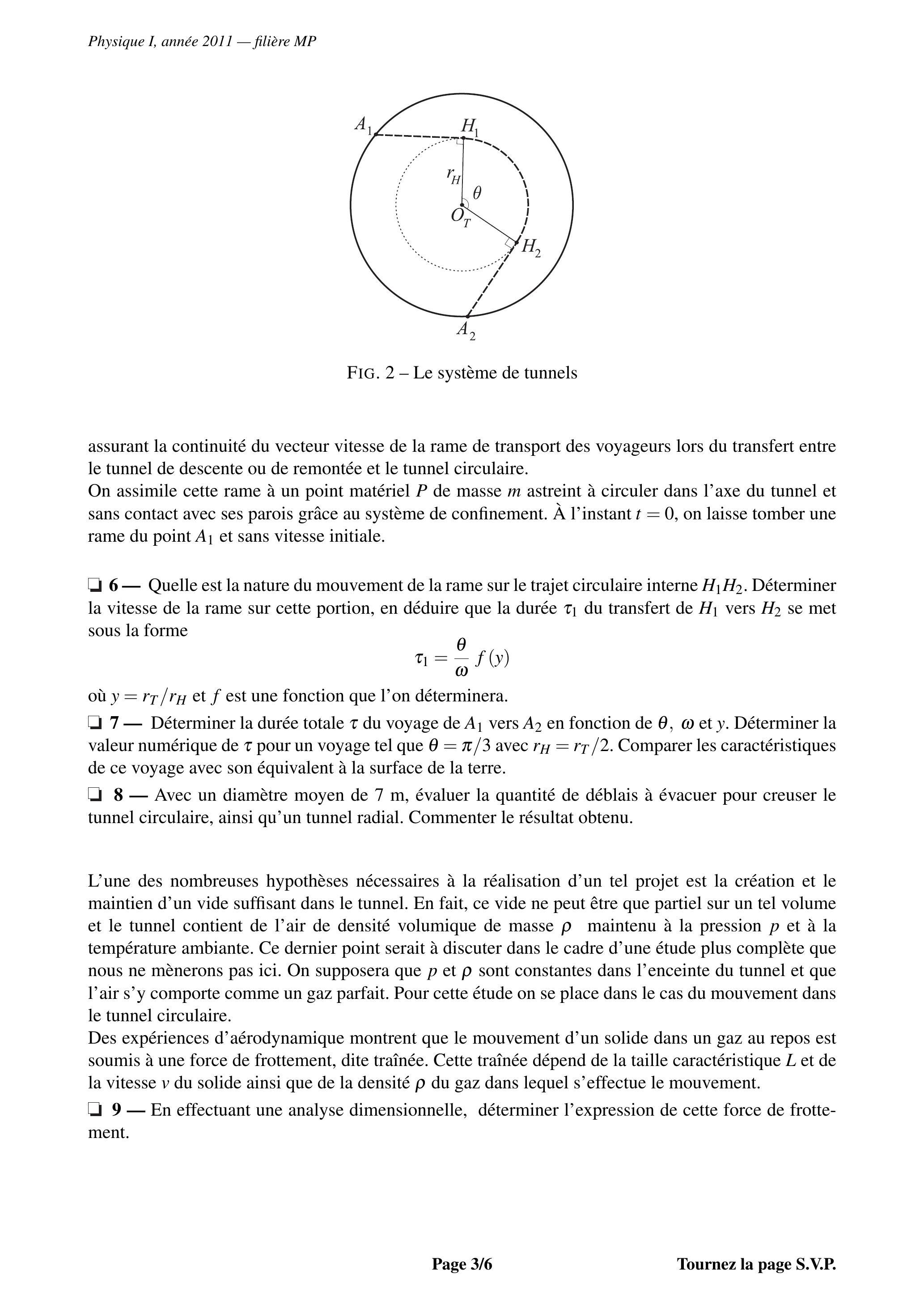 où et est une fonction que l'on déterminera. - Déterminer la durée totale du voyage de vers en fonction de et . Déterminer la valeur numérique de pour un voyage tel que avec . Comparer les caractéristiques de ce voyage avec son équivalent à la surface de la terre. - Avec un diamètre moyen de 7 m , évaluer la quantité de déblais à évacuer pour creuser le tunnel circulaire, ainsi qu'un tunnel radial. Commenter le résultat obtenu.
