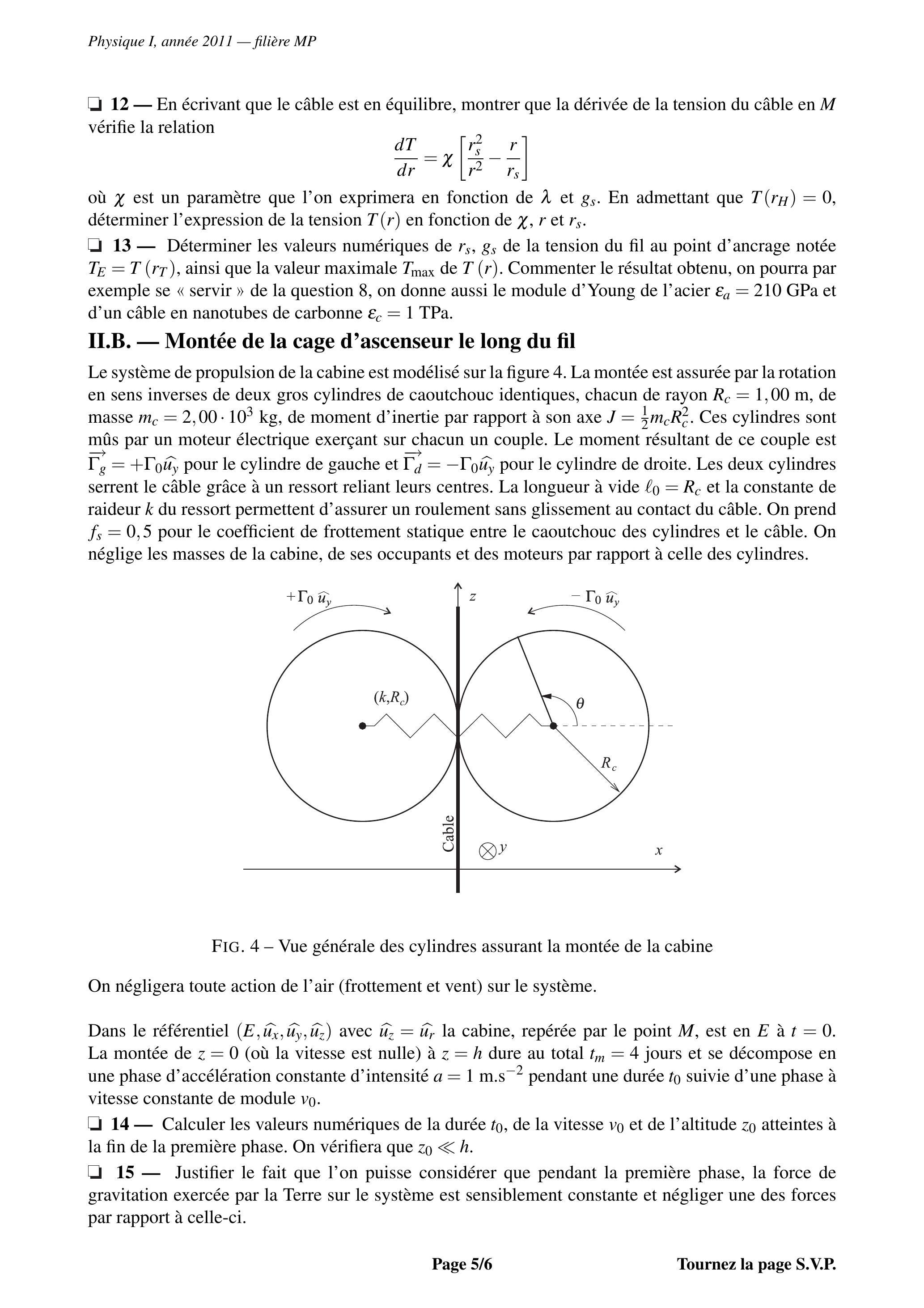 Ce problème étudie certains aspects physiques de la réalisation d'une idée récurrente dans de nombreux contextes «l'ascenseur spatial». Il s'agit d'un mécanisme permettant de s'extraire du champ de pesanteur terrestre sans utiliser de fusée. On suppose pour cela qu'un câble réalisé par filage de nanotubes de carbone, de plus de 100000 km de long, inextensible, a pu être dressé à la verticale d'un point de l'équateur de la Terre. Ce câble possède une masse linéique extrêmement faible et une résistance mécanique extrêmement forte par rapport à un câble en acier, qui le rend capable de supporter de très fortes tensions sans casser. Dans cette partie, le référentiel terrestre est en rotation uniforme autour de l'axe des pôles par rapport au référentiel géocentrique supposé galiléen. Il effectue un tour en un jour sidéral de durée . La terre est toujours supposée sphérique et homogène de masse .