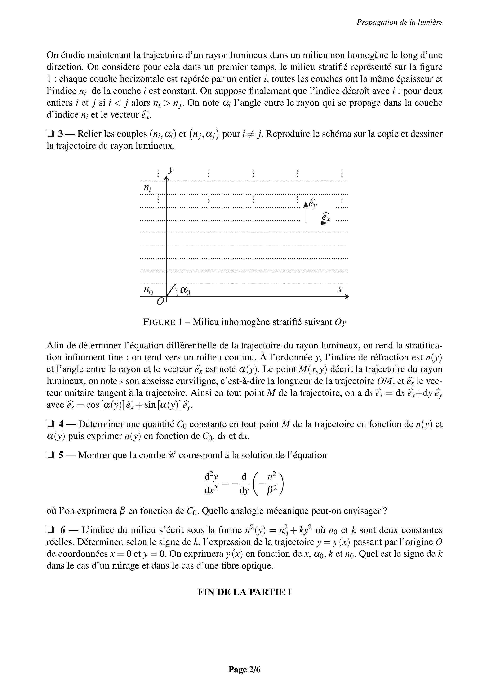 Dans le modèle géométrique de la lumière, on représente la trajectoire de l'énergie lumineuse dans un milieu d'indice de réfraction au point , par une courbe géométrique nommée rayon lumineux. L'objectif de cette partie est l'obtention d'une équation différentielle dont la solution admet cette courbe pour graphe. - Rappeler les lois de Descartes et faire un dessin pour les illustrer. Au cours de quel siècle ces lois ont-elles été proposées ? - On considère un dioptre délimitant deux milieux d'indices constants et . Expliquer la notion de réflexion totale; Démontrer qu'il existe un angle d'incidence limite pour la réfraction. On exprimera en fonction de et .