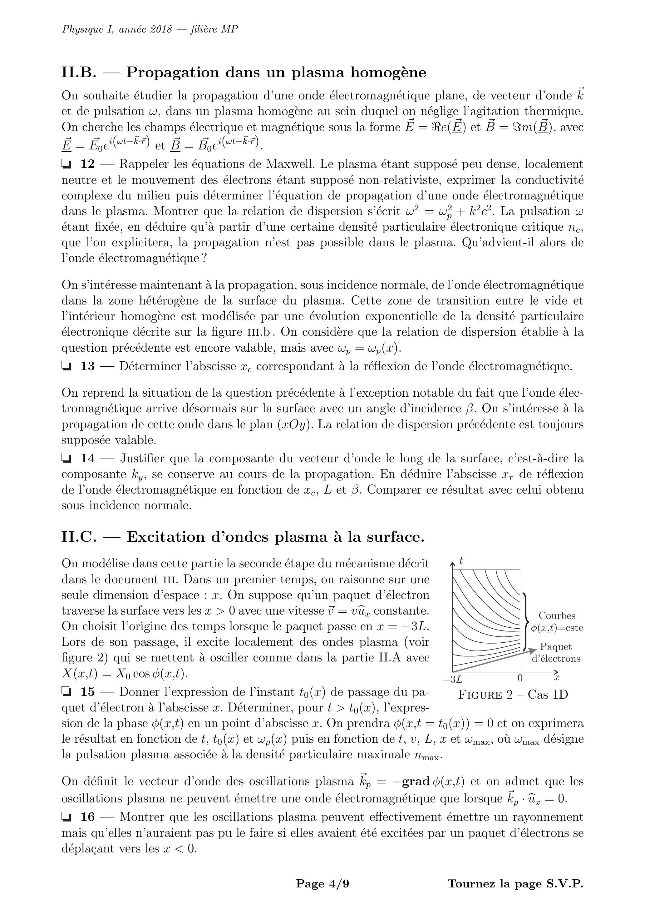 On modélise dans cette partie la seconde étape du mécanisme décrit dans le document III. Dans un premier temps, on raisonne sur une seule dimension d'espace : . On suppose qu'un paquet d'électron traverse la surface vers les avec une vitesse constante. On choisit l'origine des temps lorsque le paquet passe en . Lors de son passage, il excite localement des ondes plasma (voir figure 2) qui se mettent à osciller comme dans la partie II.A avec .