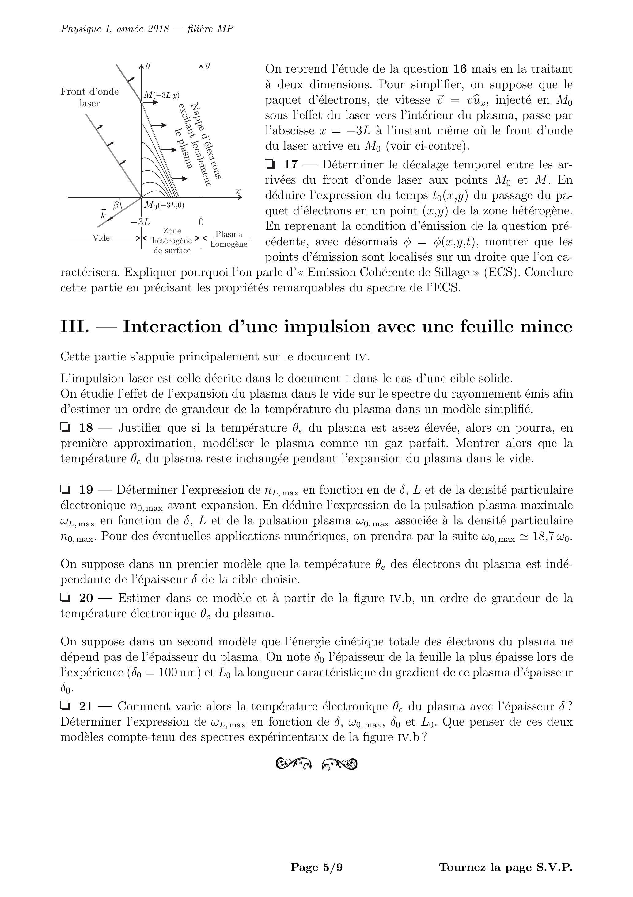 • 17 - Déterminer le décalage temporel entre les arrivées du front d'onde laser aux points et . En déduire l'expression du temps du passage du paquet d'électrons en un point ( ) de la zone hétérogène. En reprenant la condition d'émission de la question précédente, avec désormais , montrer que les points d'émission sont localisés sur un droite que l'on capoints d'émission sont localisés sur un droite que l'on ca-