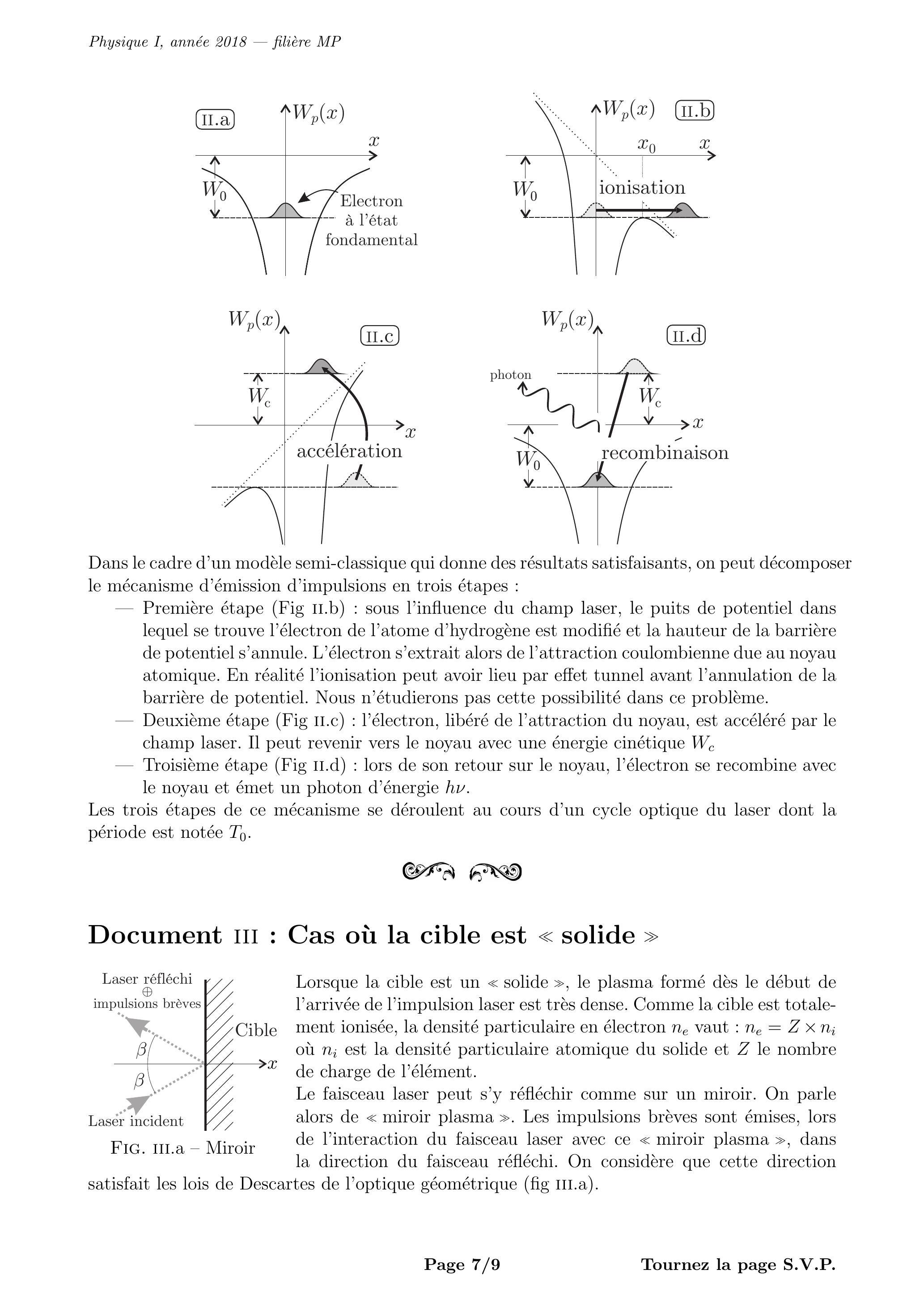 • 7 - Justifier qu'il y a deux instants privilégiés par cycle optique où l'ionisation, c'est-à-dire la traversée de la barrière de potentiel, est la plus facile. Déterminer , la position correspondant au maximum de selon . Déterminer l'expression de correspondant à une ionisation en à l'un des instants privilégiés. Cette ionisation est-elle possible dans les conditions expérimentales précisées dans le tableau du document I, avec une cible gaz ?