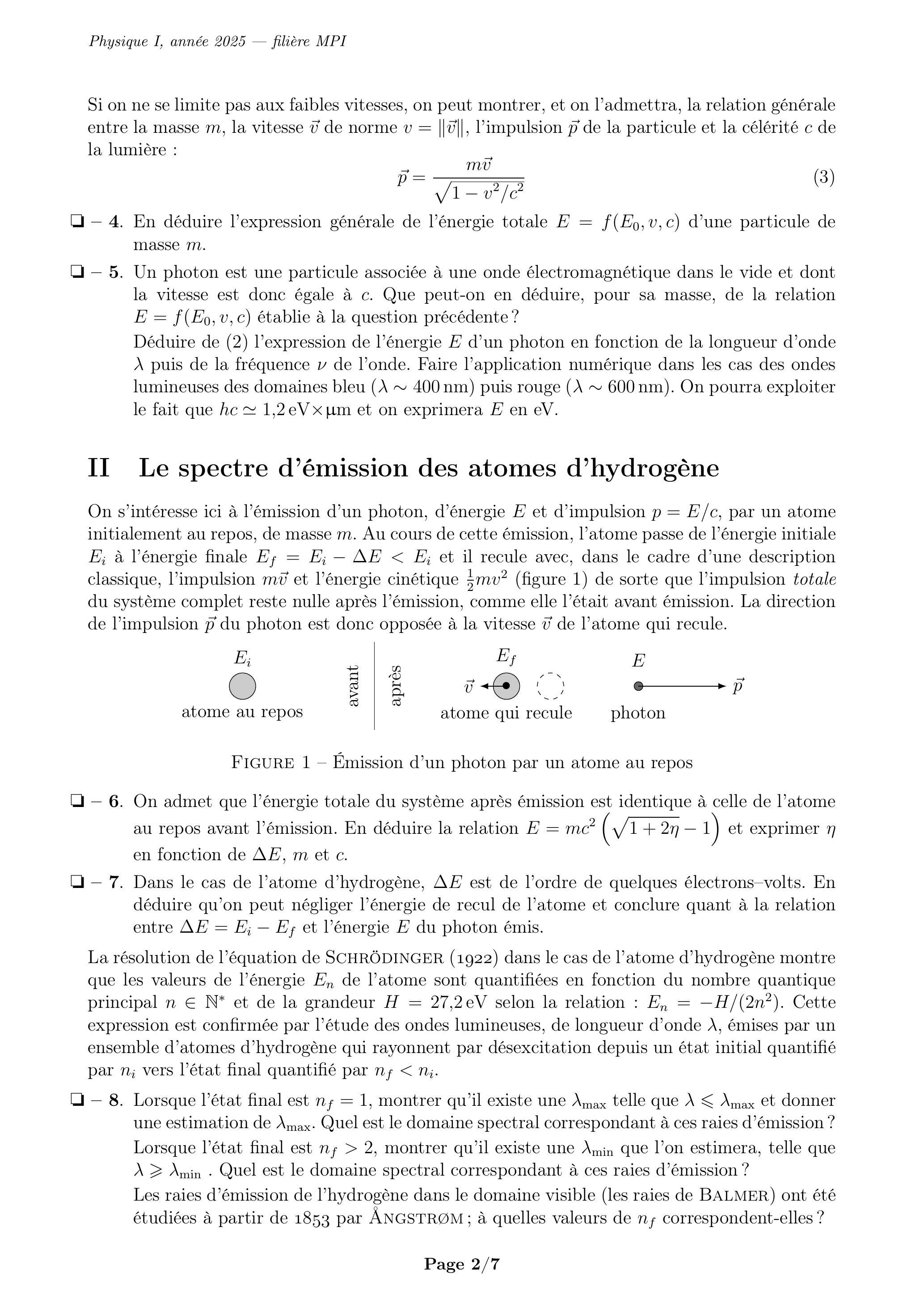1. On admet que l'énergie totale du système après émission est identique à celle de l'atome au repos avant l'émission. En déduire la relation et exprimer en fonction de et .