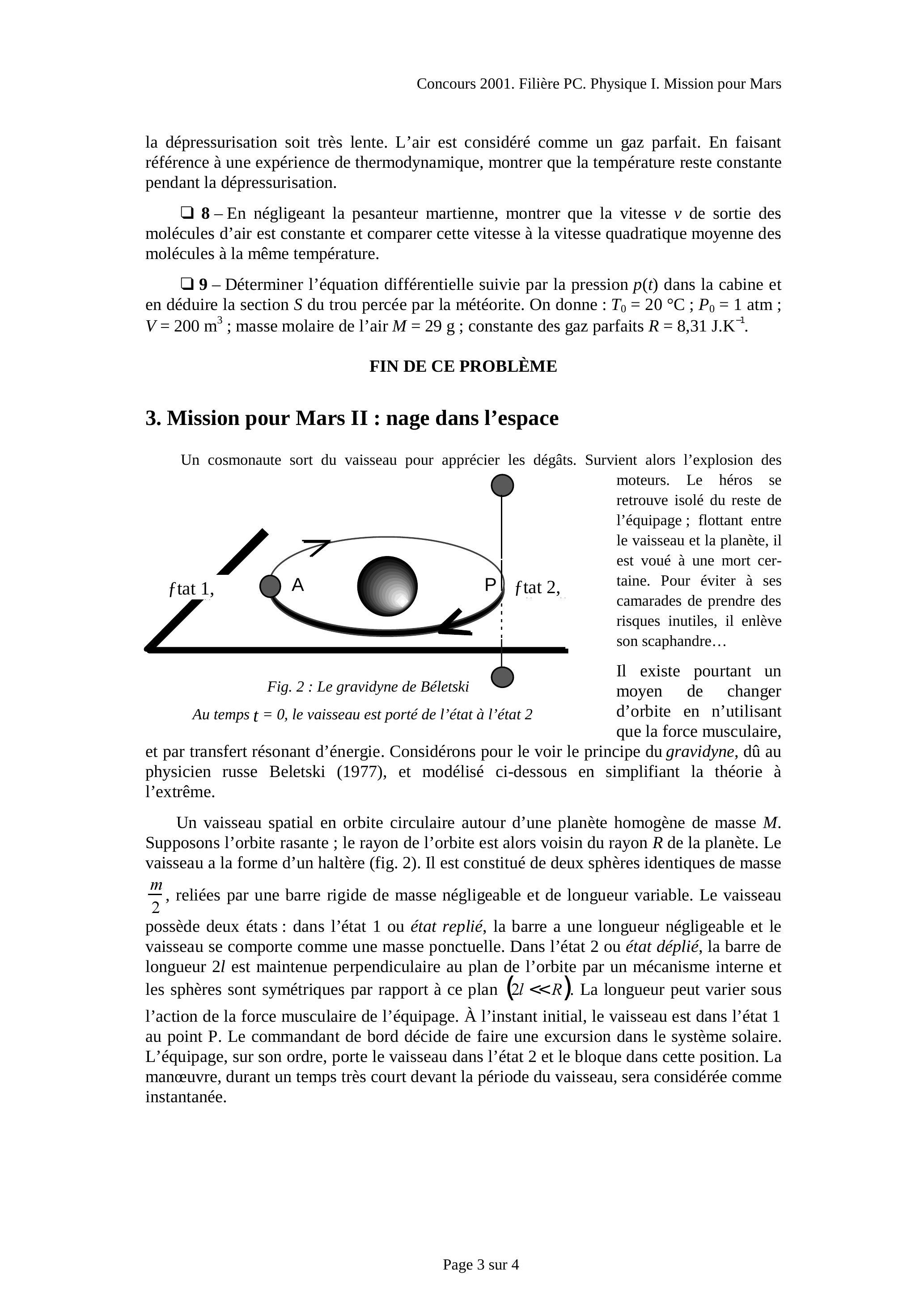 L'épreuve comprend trois problèmes indépendants les uns des autres, et que l'on pourra traiter dans l'ordre de son choix. Les deux derniers sont inspirés du film de Brian de PALMA Mission to Mars, diffusé en France en mai 2000.