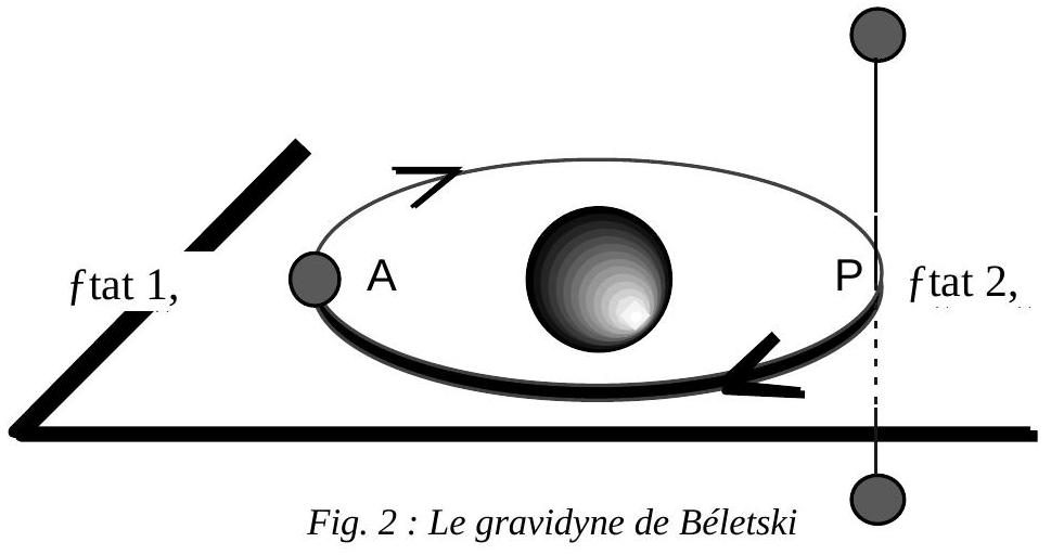 Il existe pourtant un moyen de changer d'orbite en n'utilisant que la force musculaire, et par transfert résonant d'énergie. Considérons pour le voir le principe du gravidyne, dû au physicien russe Beletski (1977), et modélisé ci-dessous en simplifiant la théorie à l'extrême.